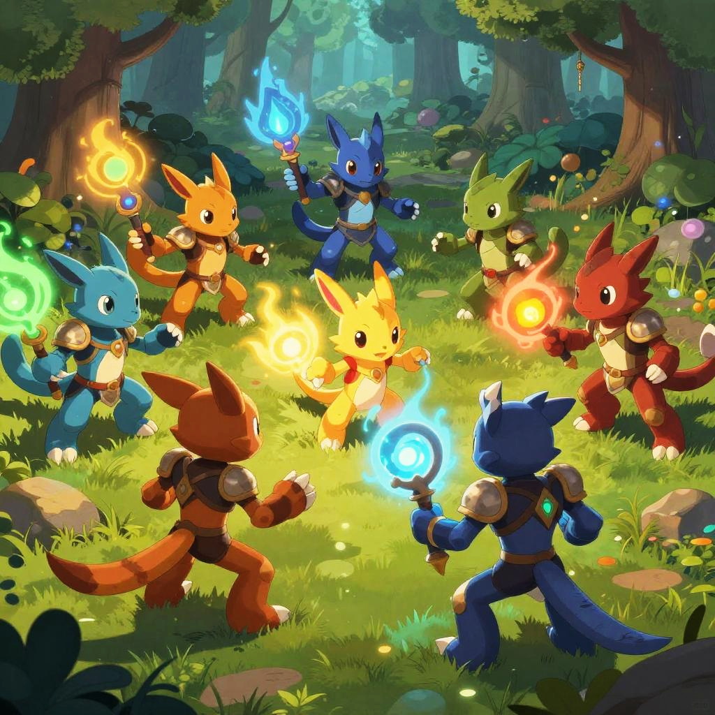Dofus magical creatures battling in a lush enchanted forest clearing, dynamic poses with elemental powers, vivid colors with glowing effects, high fantasy style, detailed character designs with armor and weapons, epic action scene