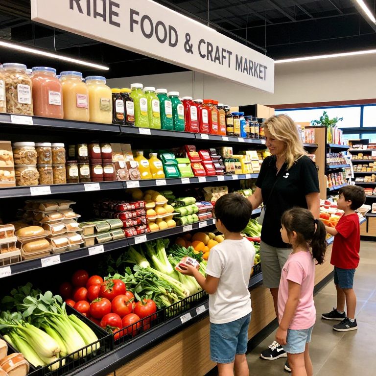 Photograph of a grocery store scene featuring a blonde woman in a black shirt and khaki shorts standing beside three children, two girls and one boy, examining the produce section. The shelves are stocked with various packaged foods, condiments, and fresh vegetables including tomatoes, cucumbers, and bell peppers. Above them, a white sign reads "RIPE FOOD & CRAPT MARKET" in black letters. The children wear casual clothes, with the boy in a red shirt and shorts, one girl in a pink shirt, and the other in a white shirt. The store has a modern, brightly lit interior with wooden flooring.