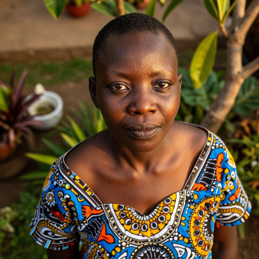 Photograph of a dark-skinned African woman with short hair, wearing a colorful, patterned dress, standing in a garden with greenery.