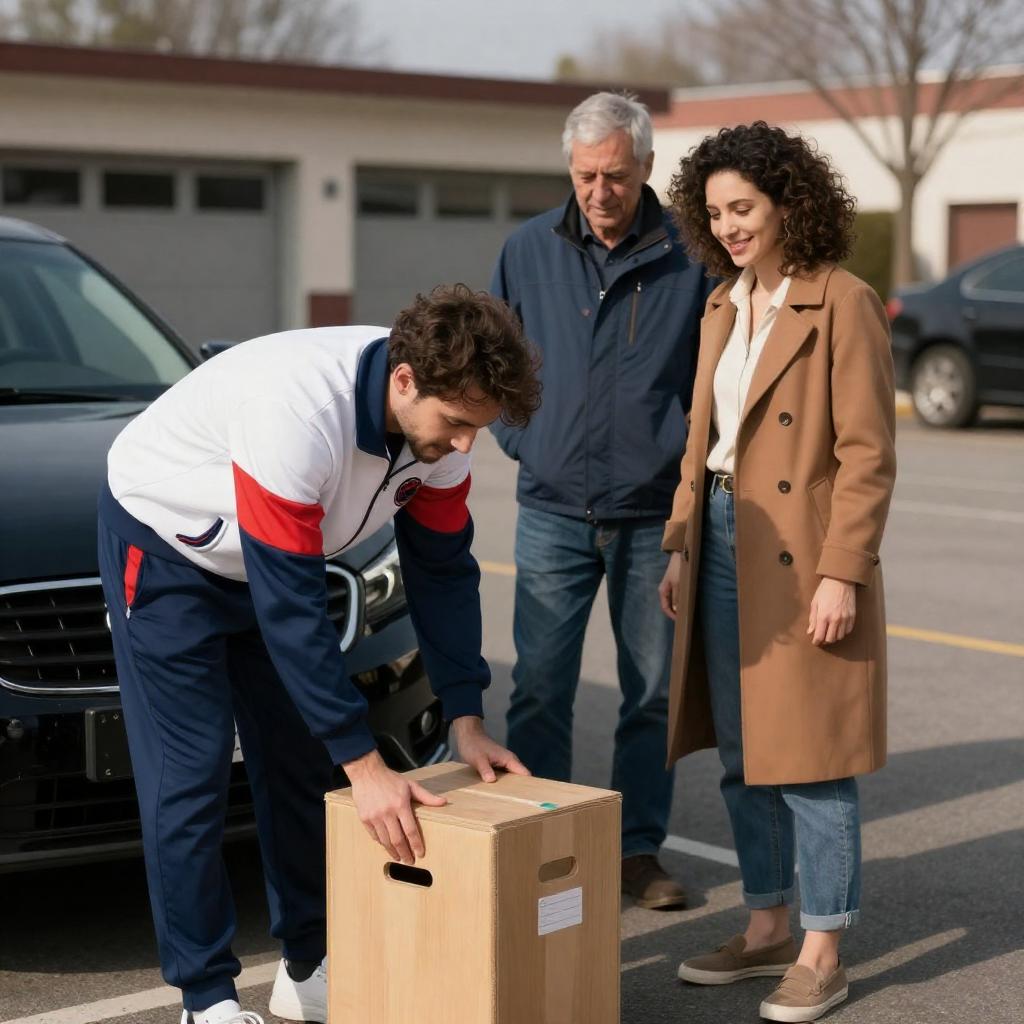 Photograph of three people in a parking lot. A man in a white, red, and blue track suit bends over a wooden box in front of a black car. A woman with curly brown hair and a brown coat stands to the right, smiling. An older man in a blue jacket and jeans stands behind her, looking down. Gray garage doors and bare trees in the background. Sunlight casts shadows.