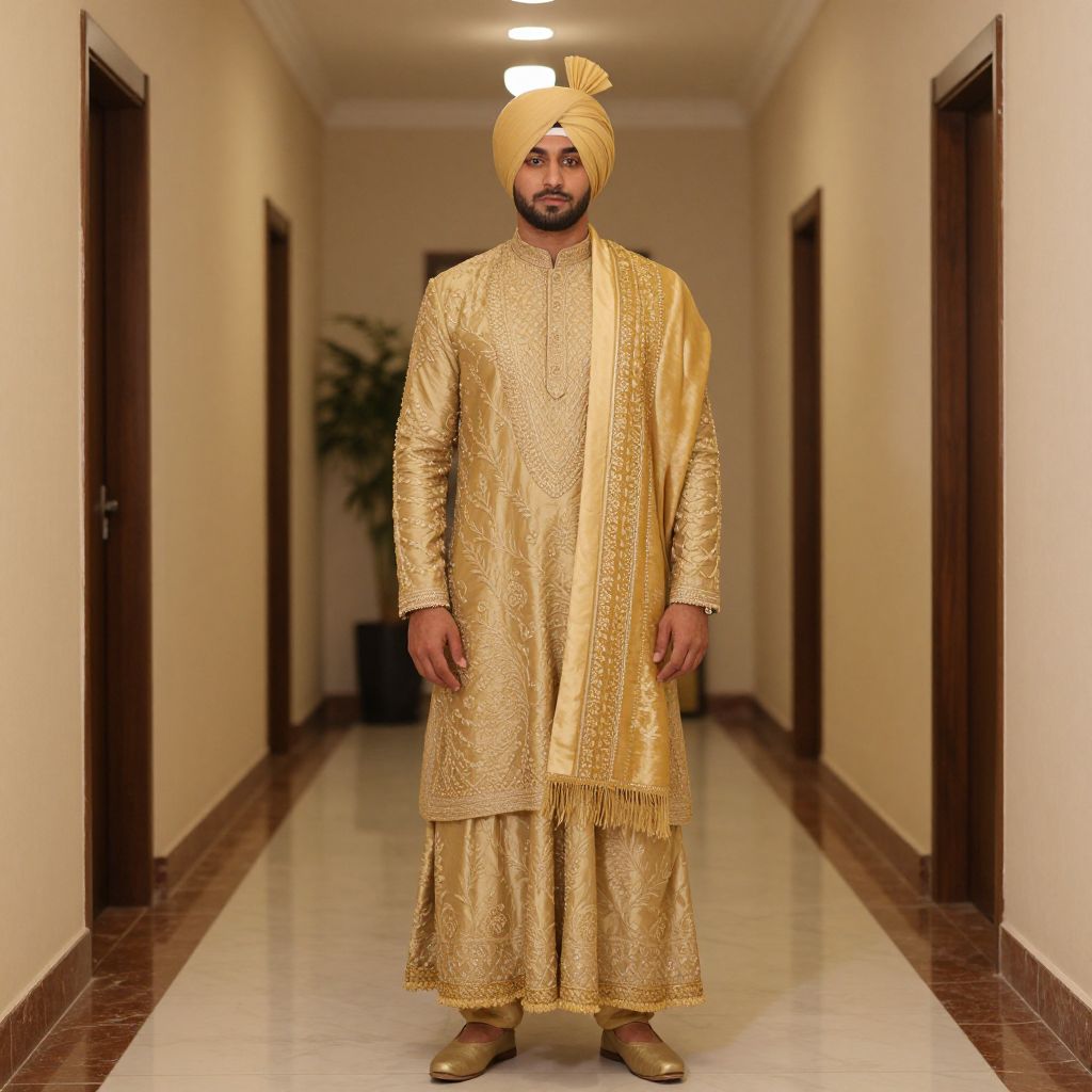 Goyal Costume, man in a turban and a gold shawl stands in a hallway