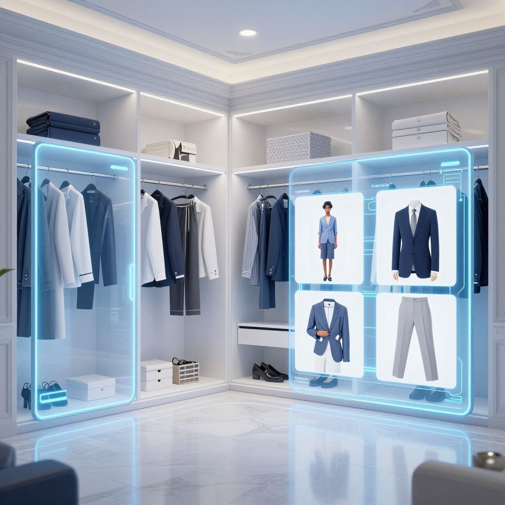 Find clothes from a picture visualization, futuristic closet with transparent screens displaying scanned photos of clothes and matching fashion items, elegant room setting, creative digital art style with blue and white tech theme