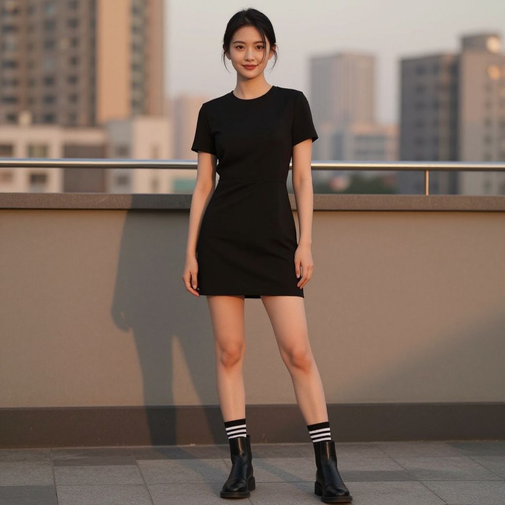 Photograph of an Asian woman standing on a rooftop against a blurred urban cityscape background. She has fair skin, straight black hair tied in a low ponytail, and wears a simple black short-sleeve dress that ends mid-thigh, paired with black ankle boots featuring white stripes near the top. Her hands rest by her sides, and she gazes directly at the camera with a neutral expression. The rooftop has a beige wall and a metal railing, with tall buildings visible in the distance, bathed in soft, late-afternoon sunlight. The overall style is modern and minimalist.