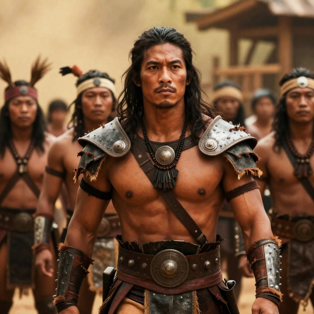 Group of seven men standing in a desert camp with mountains and tents in the background. Central figure is a tall, muscular bald man wearing leather armor and boots, standing confidently with arms crossed. Surrounding him are six men dressed in dark, rugged traditional clothing, including two elderly men, one with a white beard. The scene is sunlit under a clear sky, evoking a historical or fantasy setting.