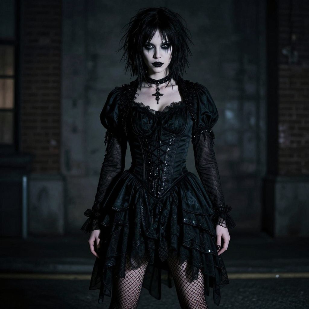 Gothic woman with messy black hair, dark makeup, black leather jacket, ripped jeans, and choker walks down a neon-lit, rainy