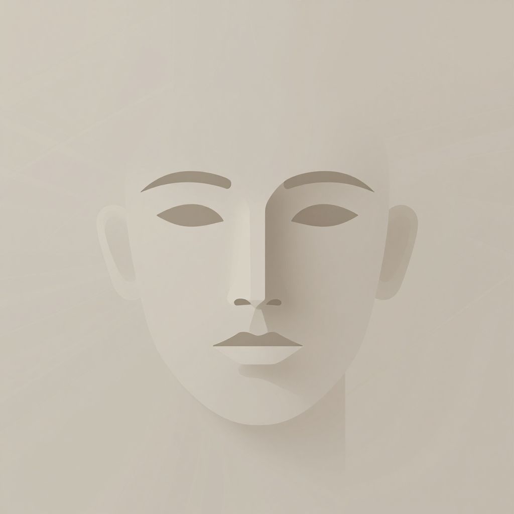 Minimalist digital illustration of a white, abstract face with simple, dark brown eyes, eyebrows, and lips, set against a bright, gradient white background