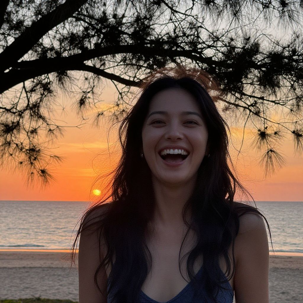 Photograph of a smiling young woman with long, dark hair, standing at a beach during sunset, silhouetted by tree branches, with an