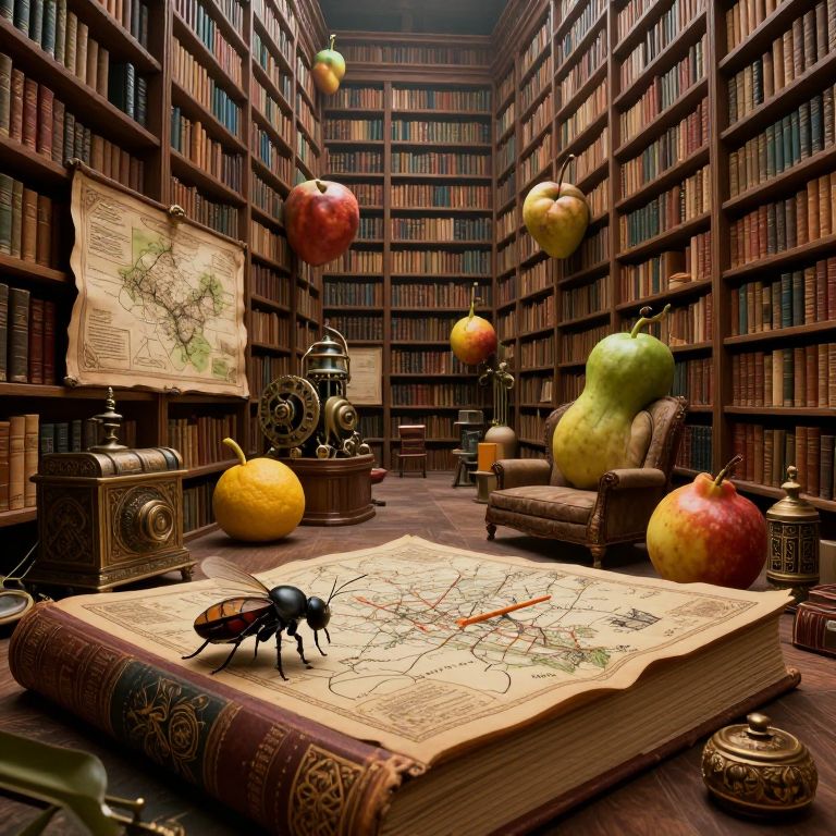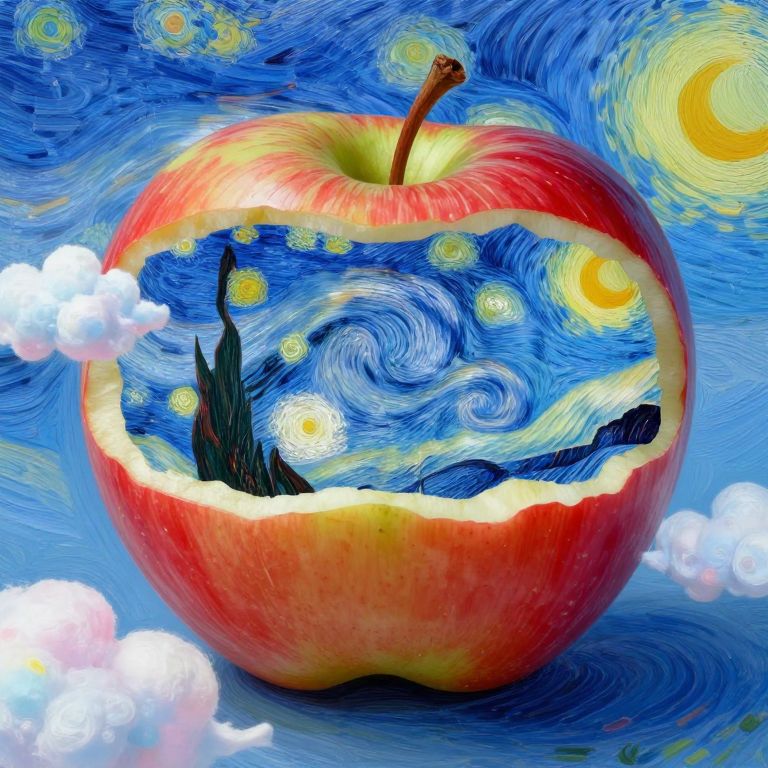 In the vein of surrealist art, create an image featuring a close-up view of an apple, intricately engraved with detailed carvings revealing the interior of a mysterious cavern. The shadows within this hollow fruit cast an enigmatic glow on its surface, as if illuminated by an unseen source of light. This captivating scene should evoke a sense of wonder and intrigue, blurring the lines between reality and fantasy while challenging viewers to question their perception of ordinary objects.