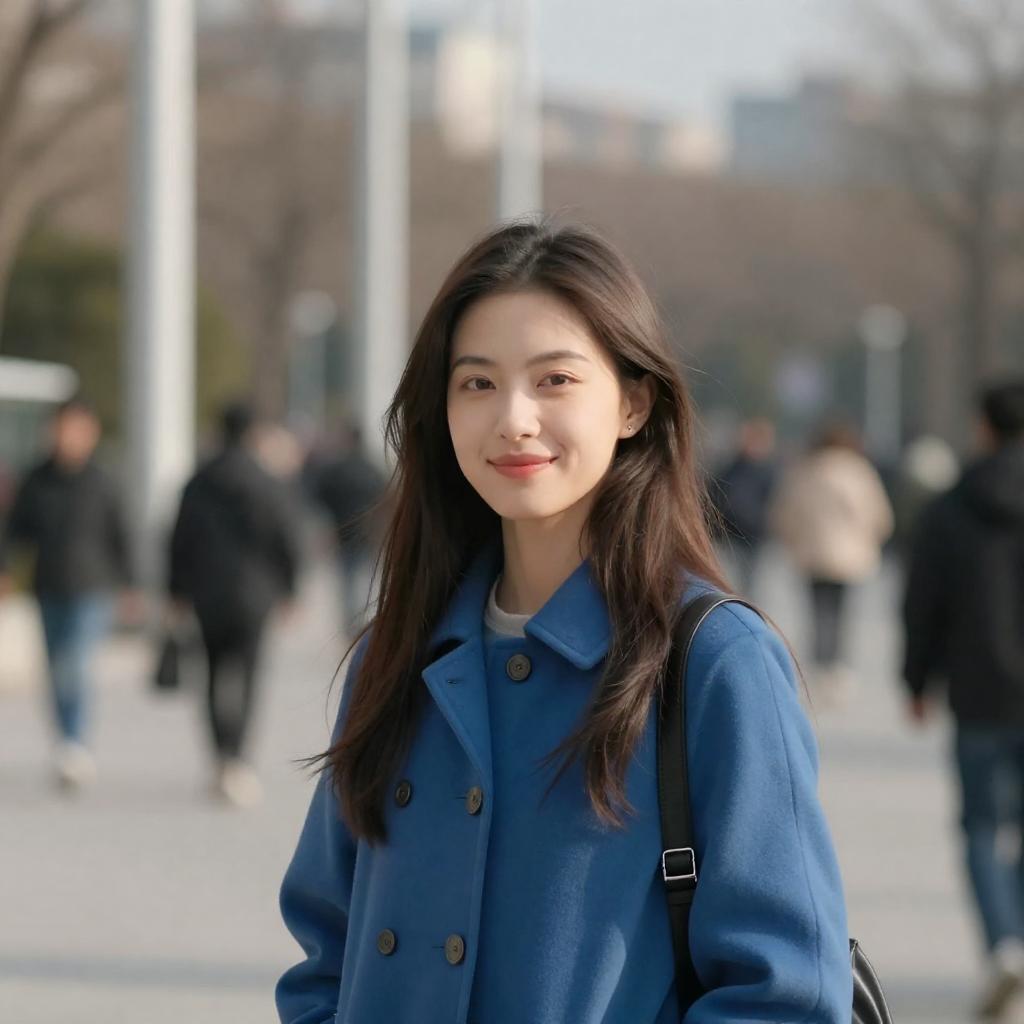 Photograph of a young woman with long brown hair, wearing a blue coat, smiling slightly. She stands in a sunlit urban park with blurred people and tall, white, vertical poles in the background. The image has a shallow depth of field, focusing on her face while the background is softly out of focus.