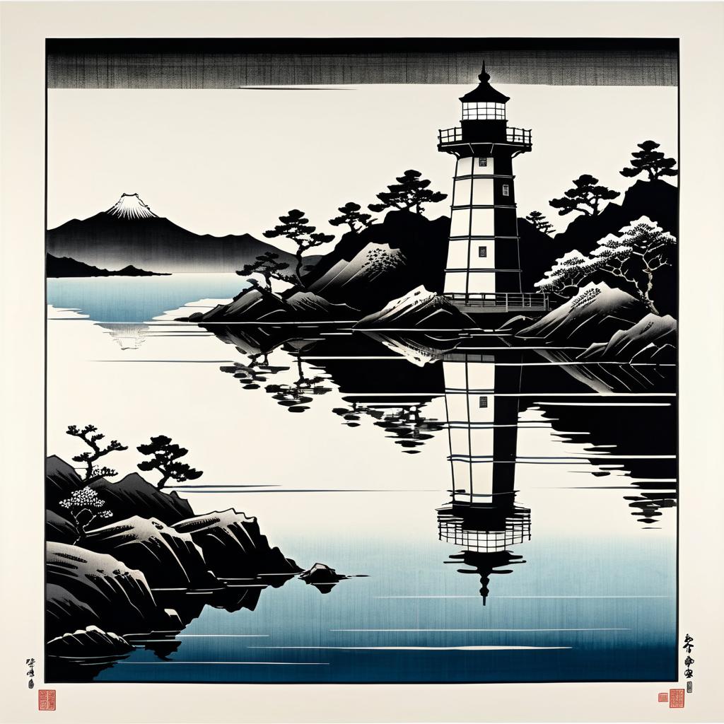 Art piece focusing on black and white coloring of lonely lighthouse rendered in Ukiyo-e woodblock print with still, reflective lake
