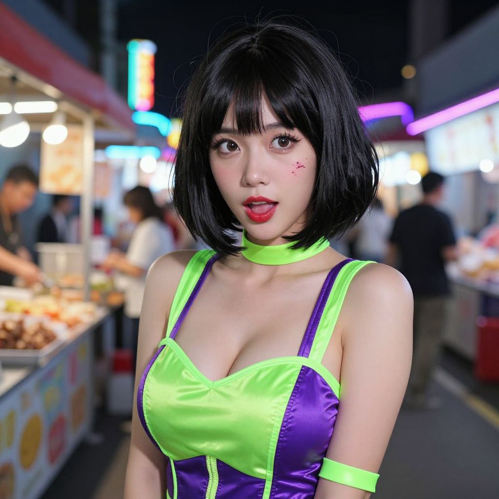 A photorealistic shot of a woman with a bob lace wig hairstyle, dressed in a bold neon-themed costume with glowing green and purple elements, standing in a neon-lit night market with colored lights and street food vendors, her face has an energetic and curious expression with bright red lipstick and a smudge of makeup, the bob lace wig is highly detailed and blends perfectly with her features, reflecting the ambient light and creating a vibrant, dynamic scene. The woman has big tits and cute face