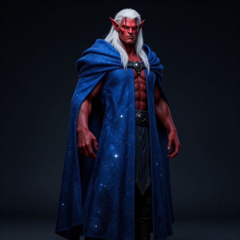 Orc full body tiefling with red skinc white hair and a black stripe tatoo across the eyes, wearing a blue cloak resembling a starry sky.,