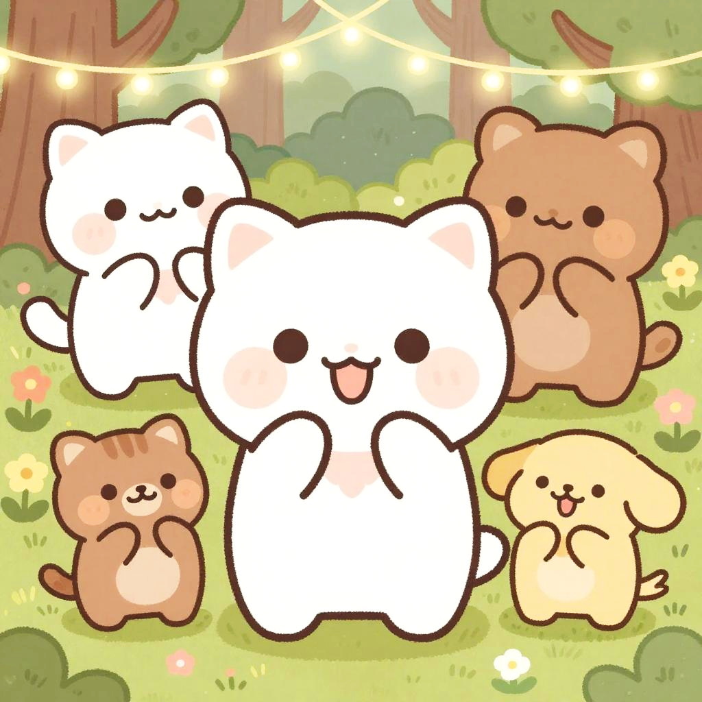 Art cartoon characters depicted as cute anthropomorphic animals, soft pastel colors, large eyes, friendly gestures, set in a cozy forest environment with blooming flowers and fairy lights, gentle shading, whimsical mood