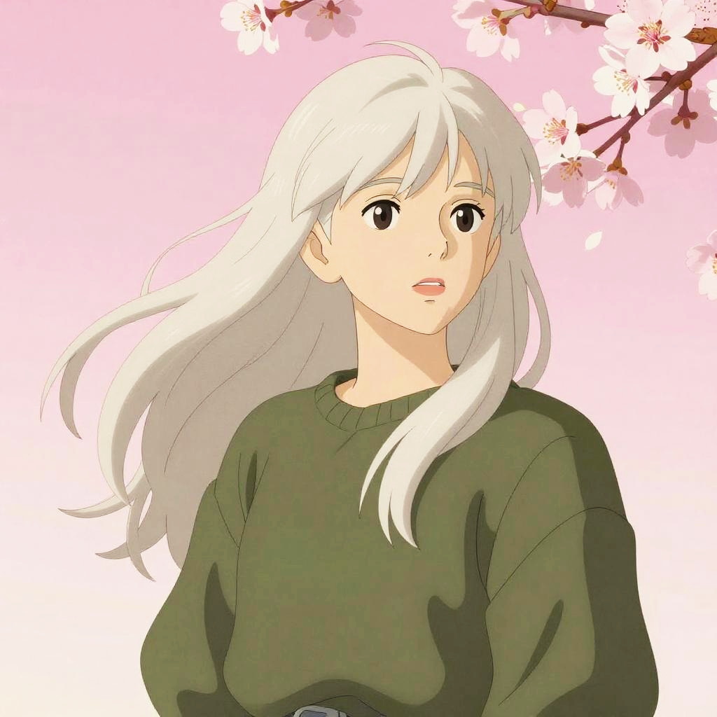 Illustration of a young Honduran anime-style girl with long alabaster hair wearing an olive green sweater. She is depicted in a realistic Ghibli-inspired style with a soft pink cherry blossom gradient background, featuring blooming branches. The image conveys a serene, solarpunk aesthetic.