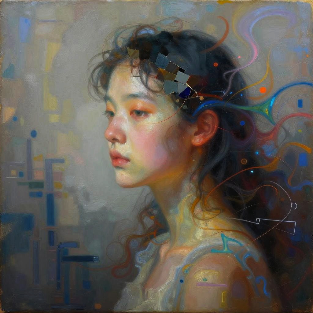 Surreal scene of AI inpainting breathing life into a fragmented surreal painting, colors and shapes morphing dynamically, with an ethereal glow and abstract digital brush strokes, illustrating the creative power of AI in the artistic restoration and enhancement process.