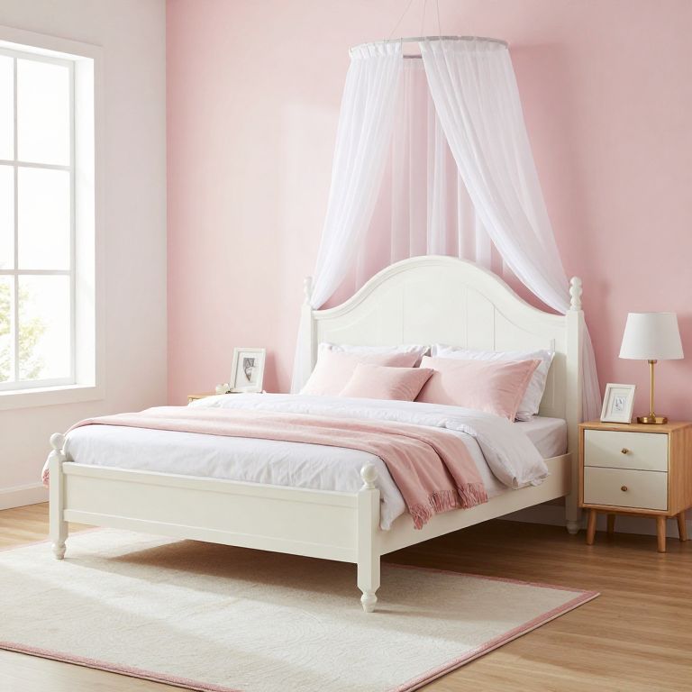 This cozy bedroom photo features a pink and white theme. The centerpiece is a white, curved-headboard bed with pink and white pillows, and a pink blanket. It's framed by white, sheer curtains draped over a canopy. The wooden nightstand on the right holds a lamp and framed picture, while a window on the left lets in natural light. The rug has a white base with a pink border.