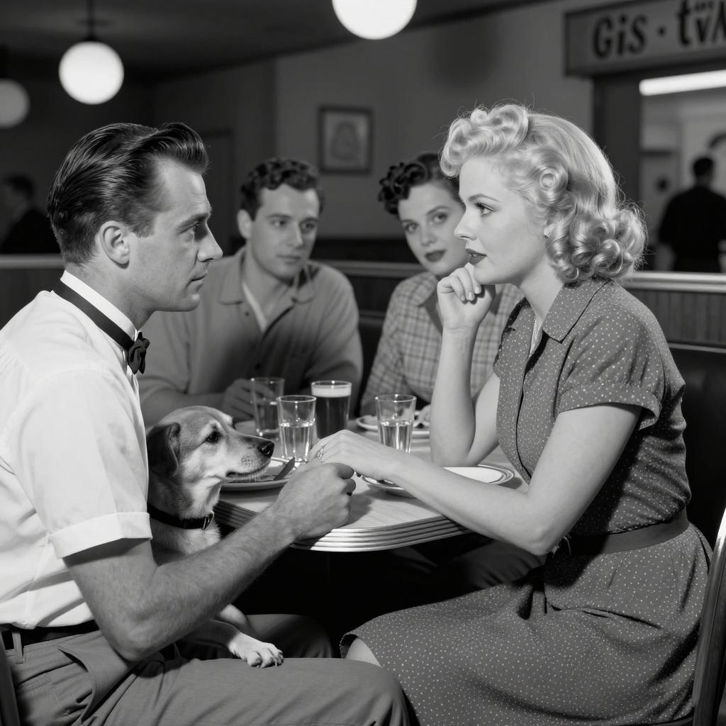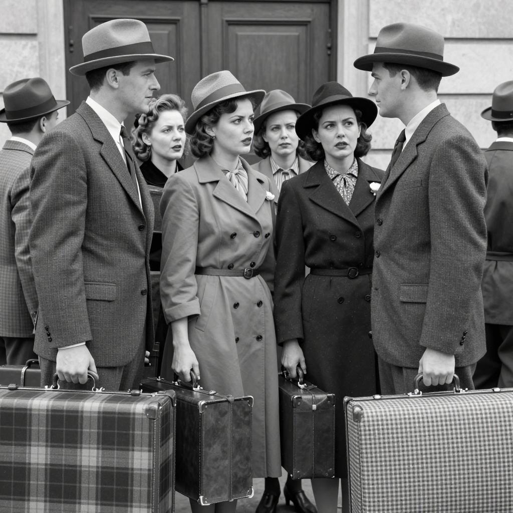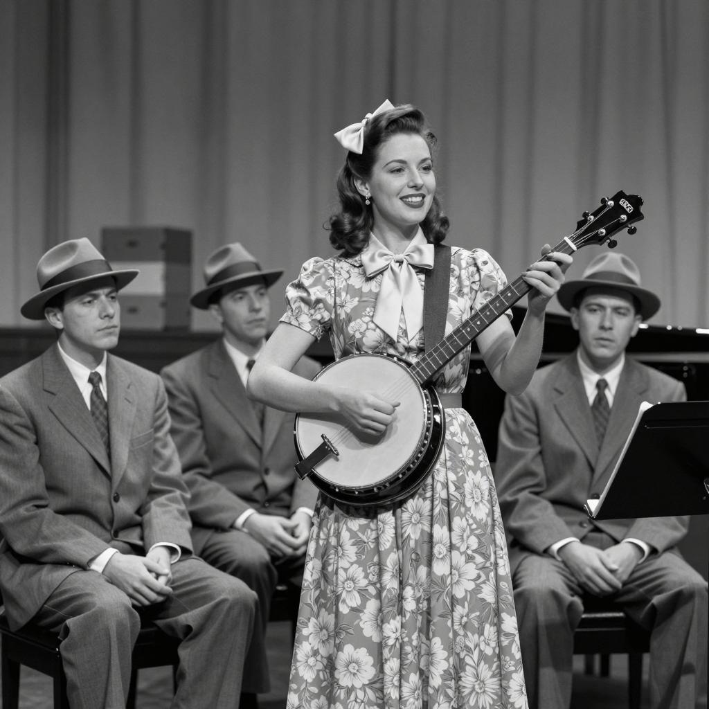 Black-and-white photograph of a 1940s-style band. Female singer with dark hair, floral dress, and large bow, stands playing a banjo. Three male musicians in suits and hats sit on stage. Piano and boxes in background. Singer smiles, others look attentive.