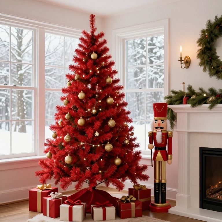 Cozy sunroom featuring a vibrant red Christmas tree adorned with golden ornaments, positioned near a large window with views of snowy trees outside, alongside a tall nutcracker figurine dressed in red and gold, standing atop stacked gift boxes beside a fireplace mantel decorated with greenery and a lit candle sconce.