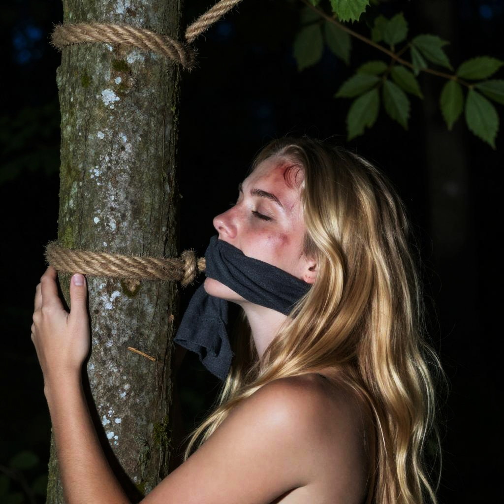 Blonde woman with long hair, bound to tree with rope, gagged with dark cloth, bruised forehead, intense side profile, nighttime, forest background, dark green leaves on tree.