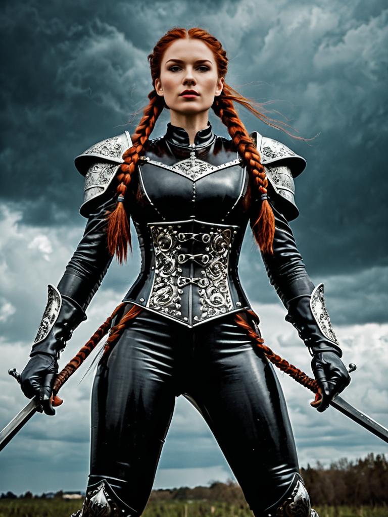 Image in the style of Expressionism, stern medieval knight princess, long auburn braids, strong muscular build, (Leather & Latex Catsuit:1.3), metal armor plate with ornate decorations, stormy cloudy sky studio background