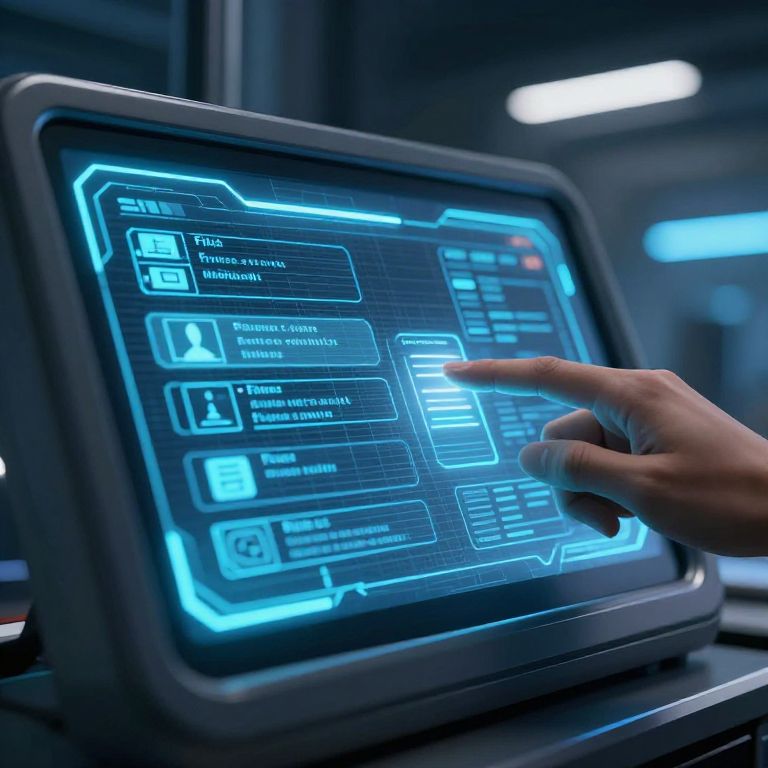 Photograph of a futuristic touchscreen interface with glowing blue icons and text, a hand pointing at it, in a dimly lit, high-tech laboratory setting
