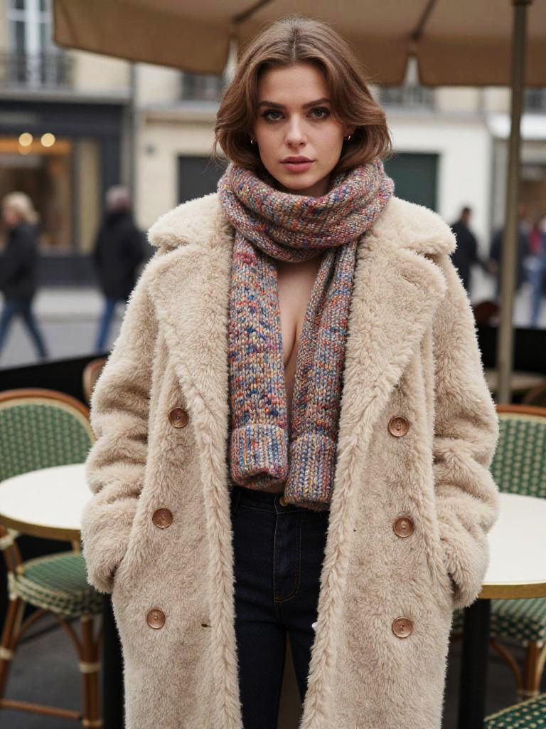 A Slim woman in a casual winter style, wearing an oversized teddy coat in soft beige with large buttons, dark jeans, and a multi-colored knit scarf draped twice around her neck, standing at a 1930s Parisian café terrace, captured in the soft, dreamy aesthetic of a Holga camera. Sexy. Pretty face and beаutiful eyes. Big breasts