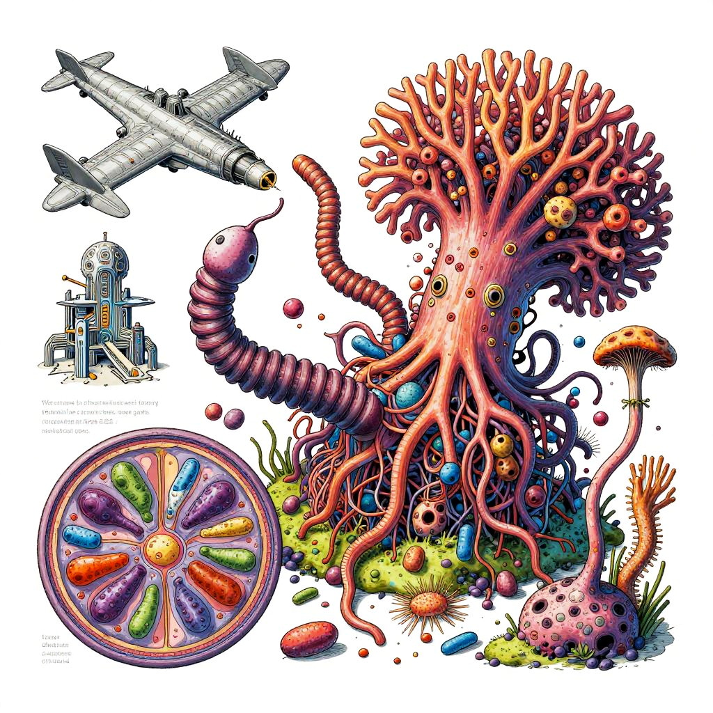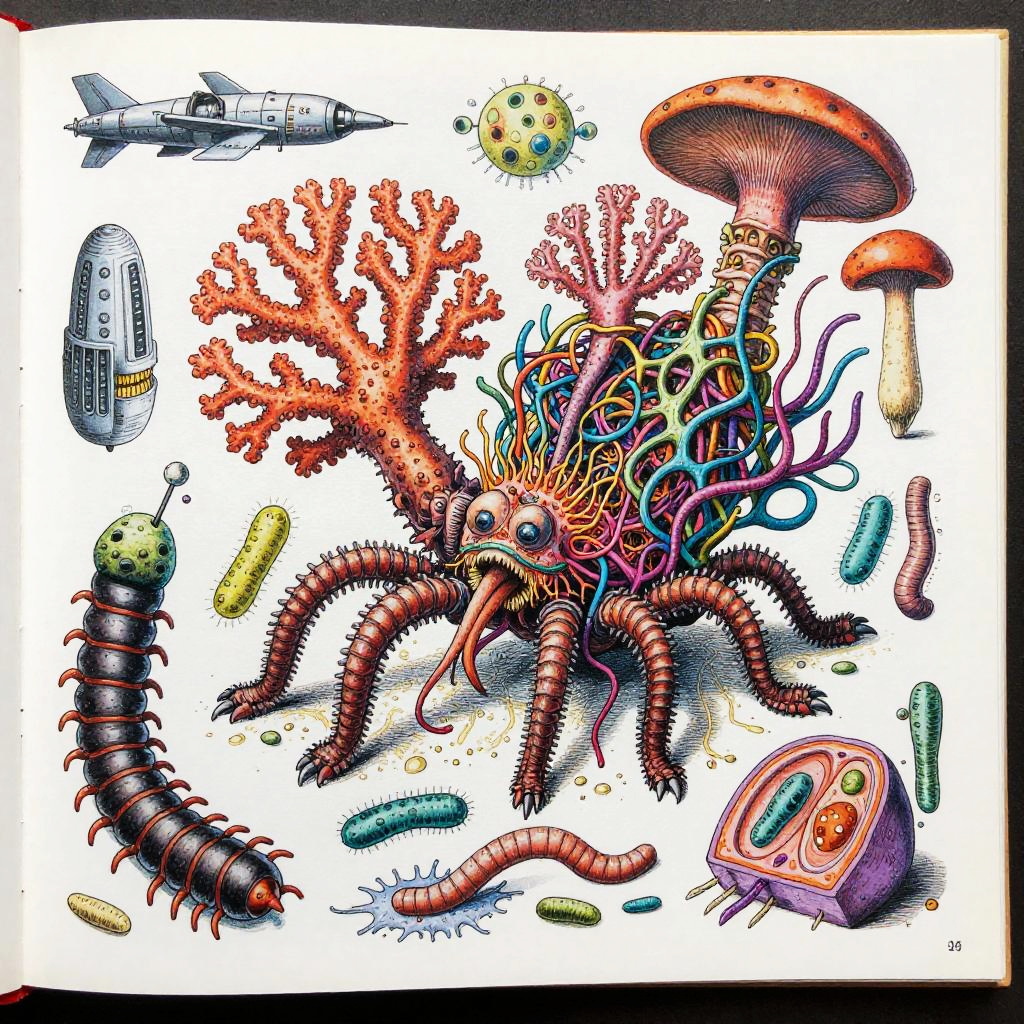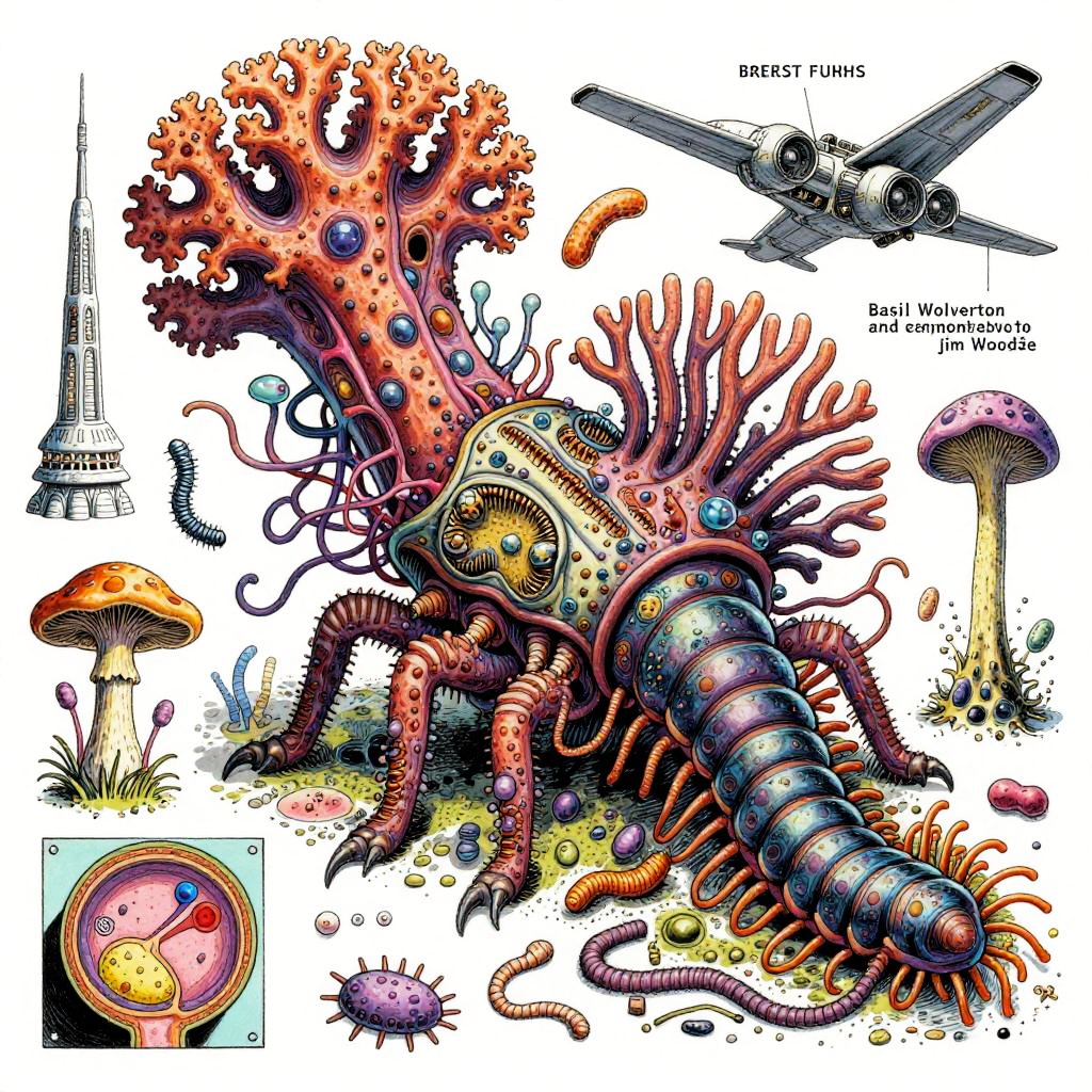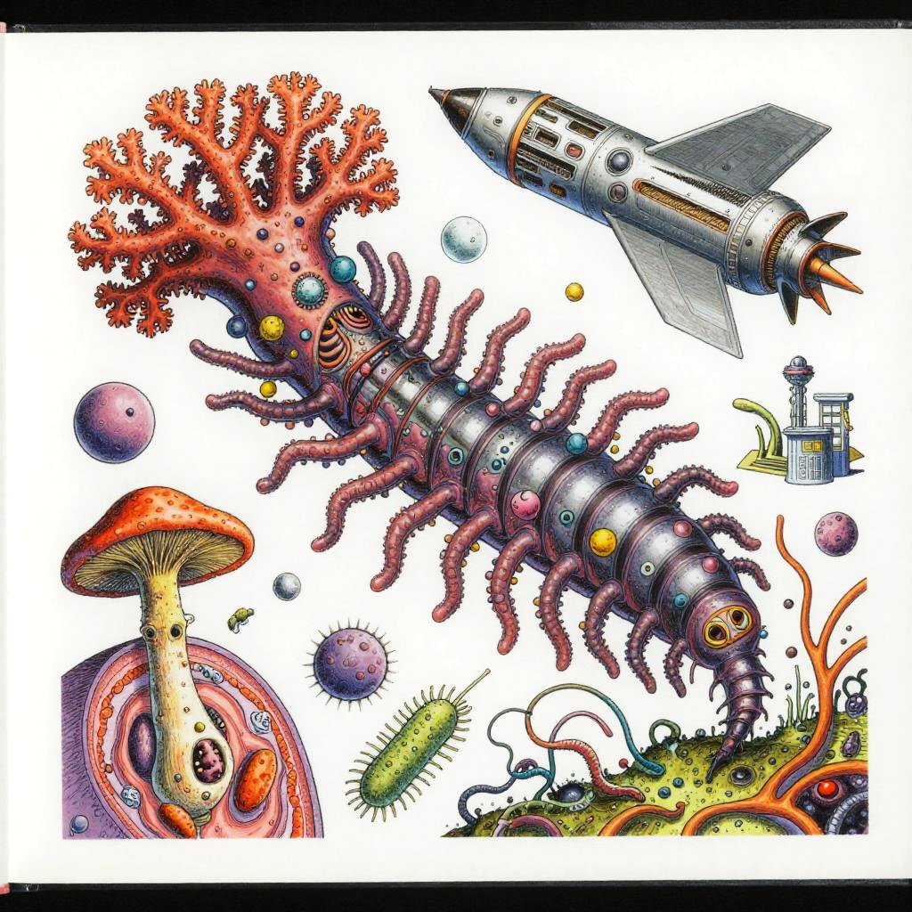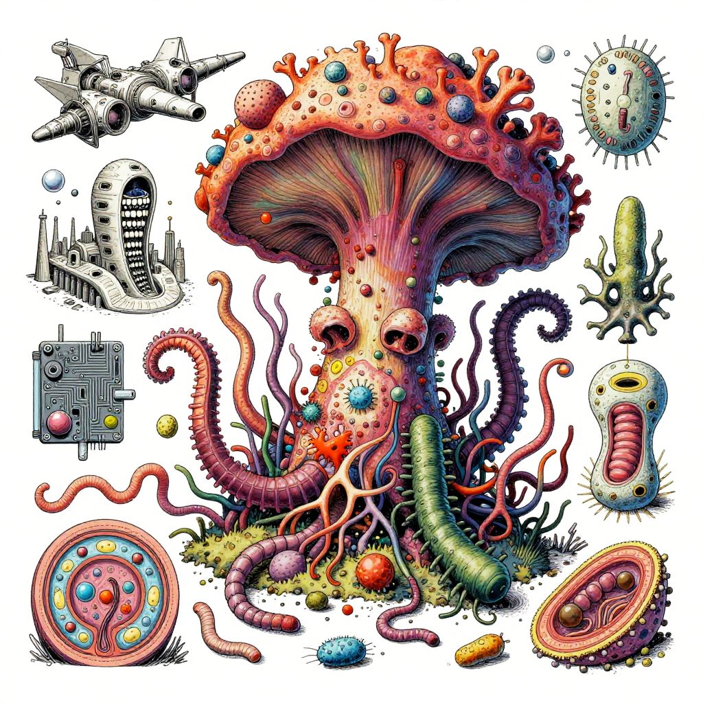 Eternity A colorful bizarre mutant scientific textbook drawing by basil wolverton and jim woodring on a white page, a strange Coral Fungi Lamprey-tardigrade-hydroid-fungus chimera with translucent siphon mouth, radial anemone frills, coral-like mycelial plating, bulbous vesicles, pustulate barnacles and segmented jet-engine gill arches hybrid creature, sea anemone glomerulus hybrid organism, tangled alien vasculature, surreal millipede covered with pustules and bubbles, ernst fuchs, jet engine diagram, futuristic alien architecture, vesicles, teeth, vertebrae structures, robert crumb, Zdzislaw Beksinski, Stinkhorn Fungus, lee bontecou, h.r. giger, axons, organ of corti, cross section, golgi apparatus, nerve fibers, bacteria, diagram, moebius, worms, critters, circuit board, hydnellum peckii, microscopic organisms, ferrofluid pattern, line art, colorful, white background.