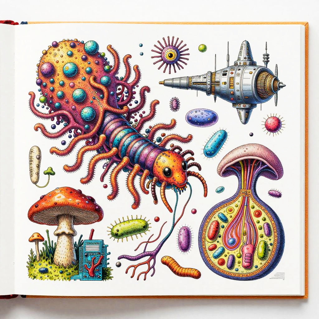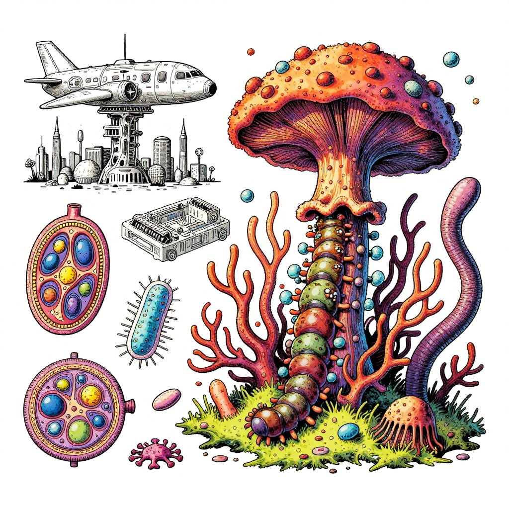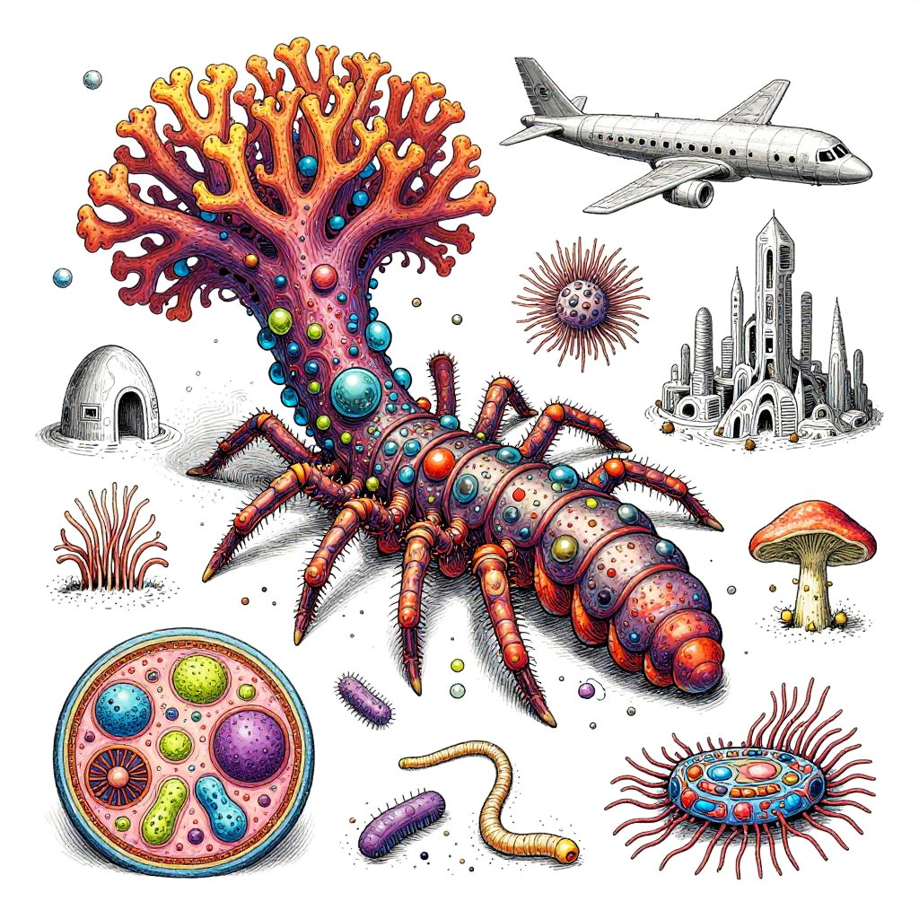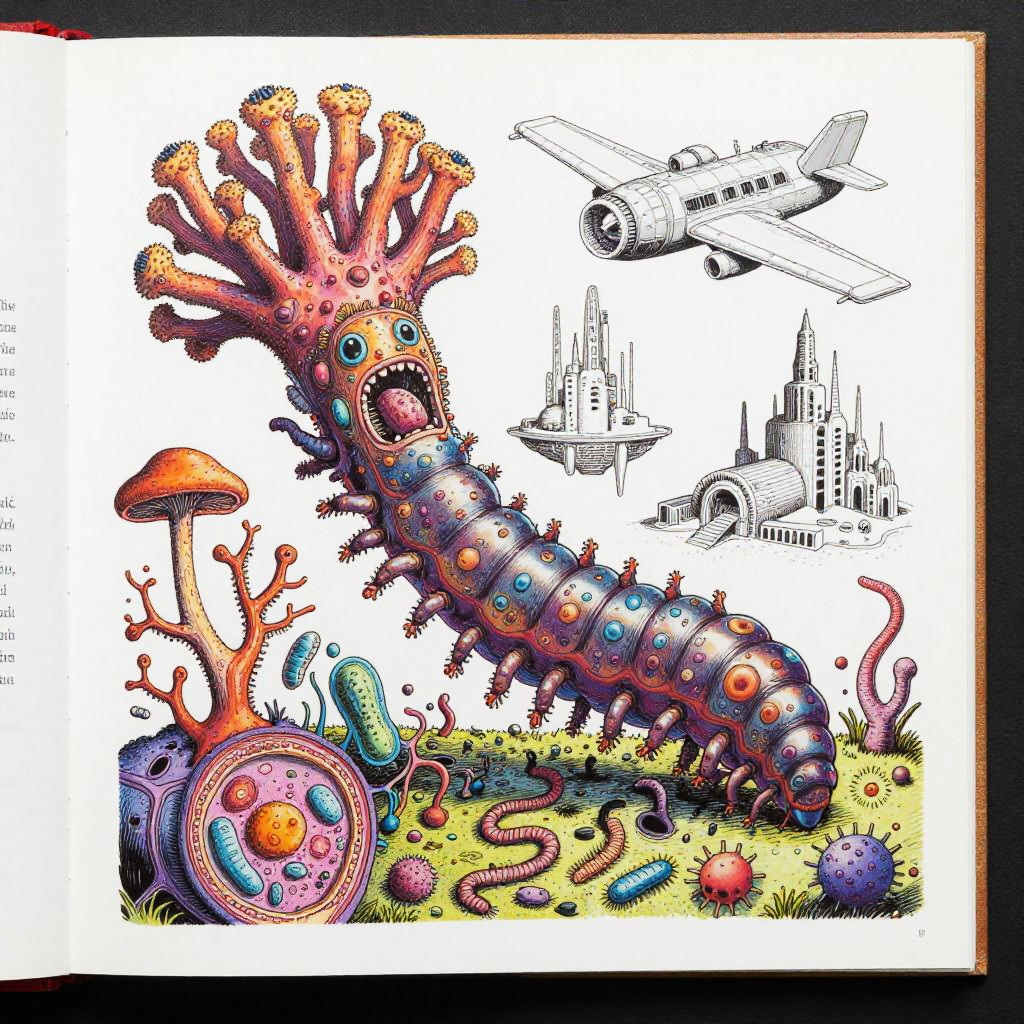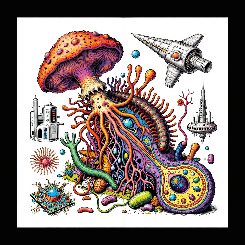 Eternity A colorful bizarre mutant scientific textbook drawing by basil wolverton and jim woodring on a white page, a strange Coral Fungi Lamprey-tardigrade-hydroid-fungus chimera with translucent siphon mouth, radial anemone frills, coral-like mycelial plating, bulbous vesicles, pustulate barnacles and segmented jet-engine gill arches hybrid creature, sea anemone glomerulus hybrid organism, tangled alien vasculature, surreal millipede covered with pustules and bubbles, ernst fuchs, jet engine diagram, futuristic alien architecture, vesicles, teeth, vertebrae structures, robert crumb, Zdzislaw Beksinski, Stinkhorn Fungus, lee bontecou, h.r. giger, axons, organ of corti, cross section, golgi apparatus, nerve fibers, bacteria, diagram, moebius, worms, critters, circuit board, hydnellum peckii, microscopic organisms, ferrofluid pattern, line art, colorful, white background.