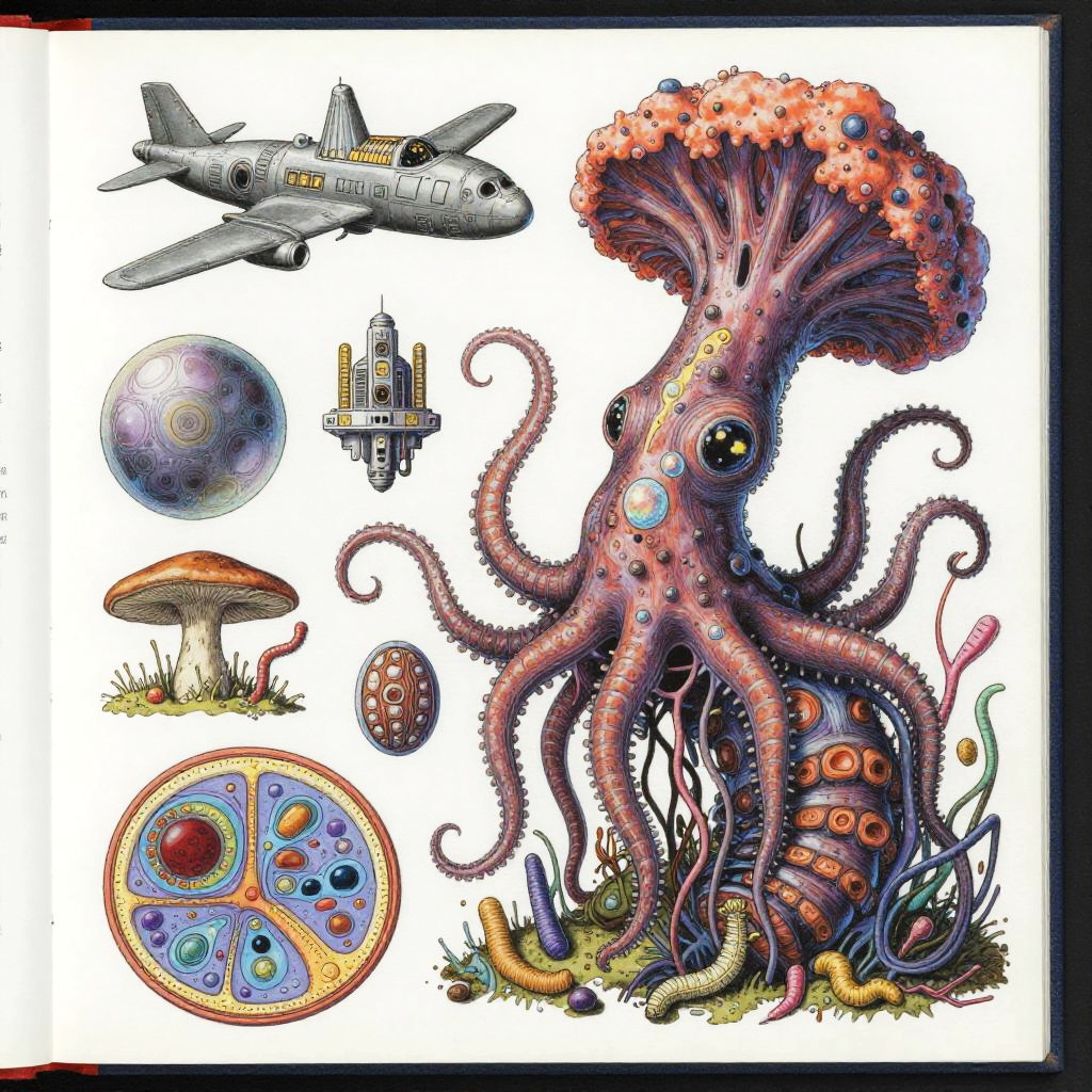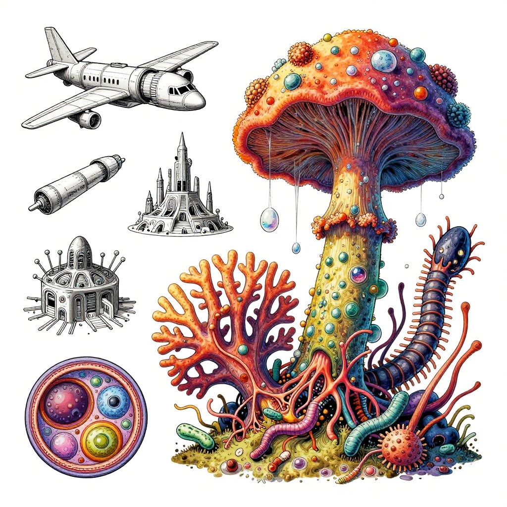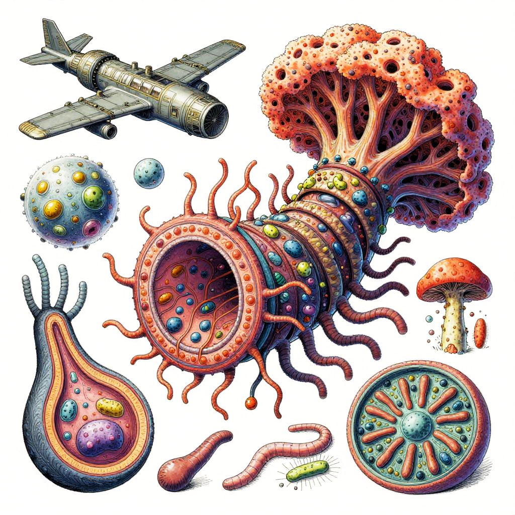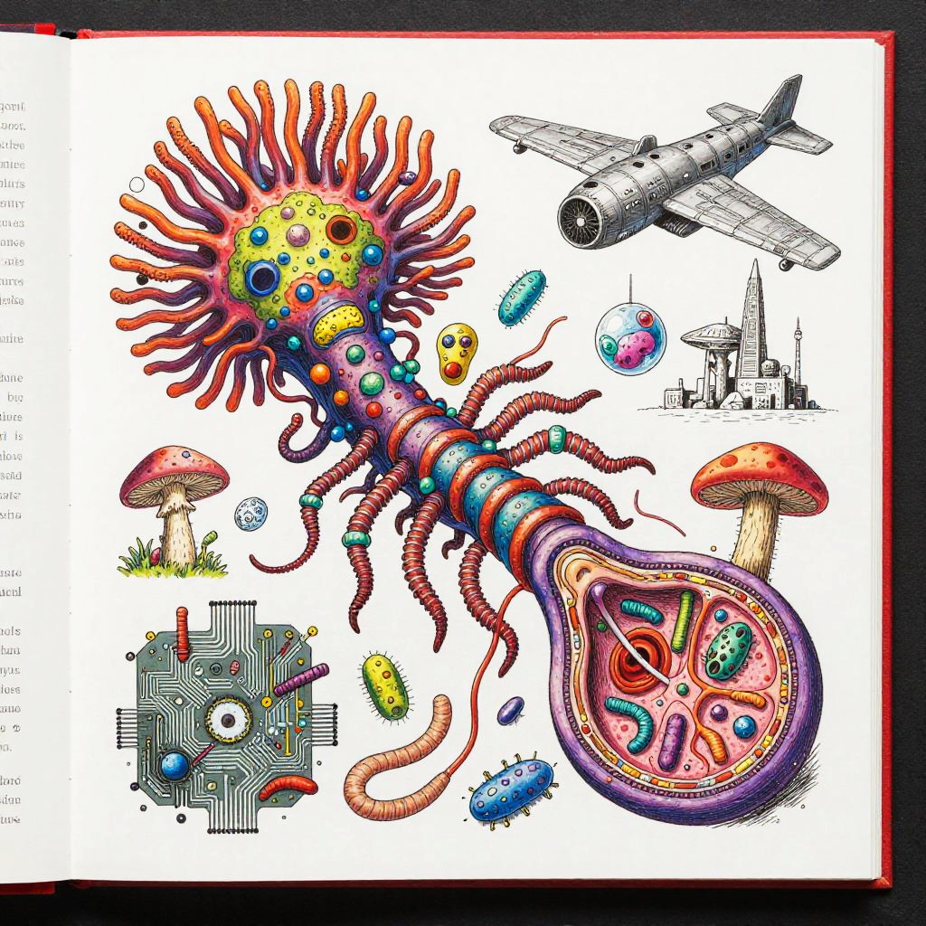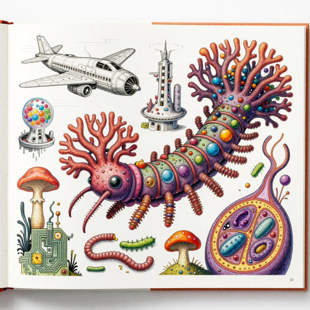 Eternity A colorful bizarre mutant scientific textbook drawing by basil wolverton and jim woodring on a white page, a strange Coral Fungi Lamprey-tardigrade-hydroid-fungus chimera with translucent siphon mouth, radial anemone frills, coral-like mycelial plating, bulbous vesicles, pustulate barnacles and segmented jet-engine gill arches hybrid creature, sea anemone glomerulus hybrid organism, tangled alien vasculature, surreal millipede covered with pustules and bubbles, ernst fuchs, jet engine diagram, futuristic alien architecture, vesicles, teeth, vertebrae structures, robert crumb, Zdzislaw Beksinski, Stinkhorn Fungus, lee bontecou, h.r. giger, axons, organ of corti, cross section, golgi apparatus, nerve fibers, bacteria, diagram, moebius, worms, critters, circuit board, hydnellum peckii, microscopic organisms, ferrofluid pattern, line art, colorful, white background.