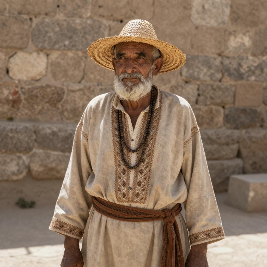 Photograph of an older man with a white beard and gray hair wearing a woven straw hat. He's dressed in an intricate, beige and brown traditional outfit with detailed embroidery, layered necklaces, and a sash. He stands in front of a stone wall, with sunlight highlighting his face and outfit, casting shadows on the ground. The overall vibe is rustic and historical.