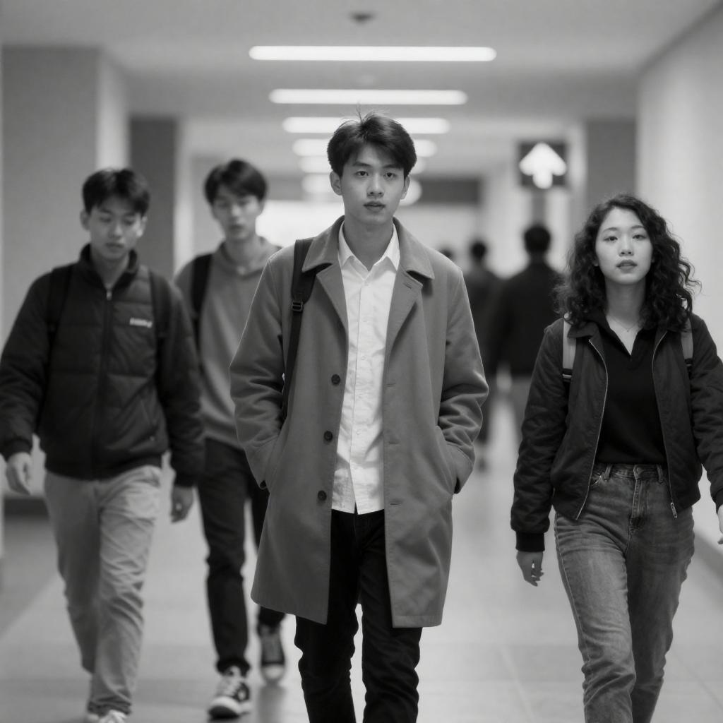 Black-and-white photo showing four young Asian adults in a busy indoor hallway. The man in the center wears a long coat over a white shirt and has his hands in pockets. A woman with curly hair wears a jacket and jeans, walking alongside him. Two other men in casual jackets and backpacks walk behind them. The hallway is well-lit with ceiling lights and indistinct figures in the background.