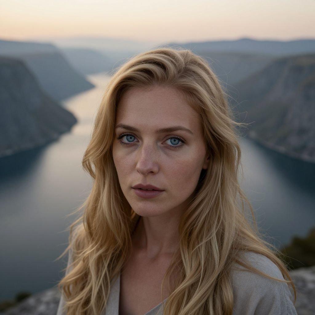 A serene Middle Eastern woman, with striking icy blue eyes and cascading blonde hair, stands against a tranquil fjord at dusk. Soft golden light filters through a gentle mist, illuminating her delicate features as seen from an aerial perspective. Her contemplative expression reveals intricate details of wisdom and resilience etched on her complexion. This evocative portrait captures the bridge between human experience and nature's eternal beauty.