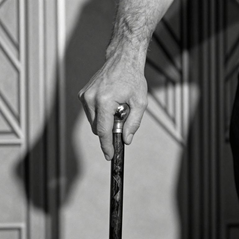 Black-and-white photograph of a male hand gripping a cane. The hand, with visible wrinkles and veins, is positioned at the center, gripping the cane's metallic handle tightly. The background features geometric-patterned wooden panels, partially blurred, creating a shadow effect. The lighting is stark, emphasizing the textures of the hand and cane. The image has a dramatic, high-contrast style, highlighting the details and creating a sense of depth and focus on the hand and cane.
