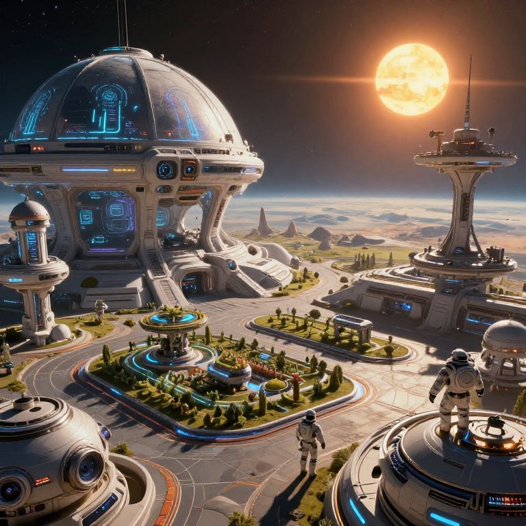 This is a highly detailed, digital CGI image of a futuristic sci-fi landscape featuring several large, dome-shaped space stations with glowing blue and orange accents, set against a backdrop of a bright, orange sun and a starry sky. The space stations are connected by curved, paved roads adorned with small, lush green parks and trees. Smaller, cylindrical structures are scattered around the space stations. The ground is dotted with futuristic buildings and pathways, and the horizon shows a distant, mountainous terrain. The image has a vibrant, high-contrast color palette, with a mix of metallic and organic textures.