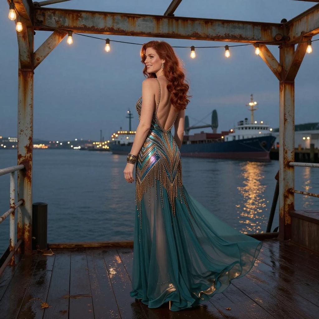 Masterpiece, best quality, (photorealistic:1.4), full body, ultra-detailed photo of a petite auburn woman with loose waves, wearing a backless iridescent teal-and-bronze beaded Art Deco gown with cascading fringe at the hips, cinched waist, a sheer chiffon overskirt that catches the breeze, and antique brass cuff bracelets, standing in a weathered industrial shipyard gantry at dusk overlooking a glowing harbor, strings of Edison bulbs draped between rusted beams, wet wooden planks and distant cargo lights reflecting on rippling water, smiling with an hourglass silhouette, viewed completely from behind