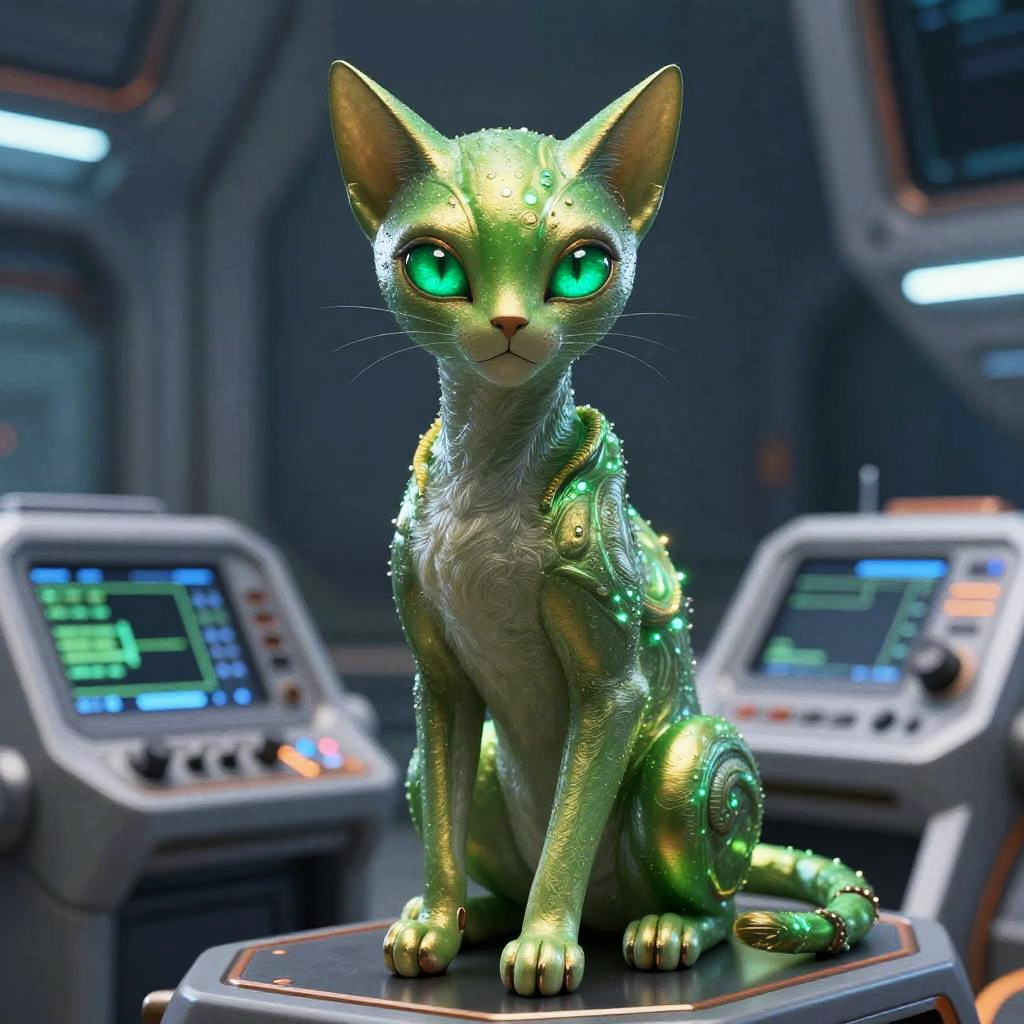 Green alien cat with glowing emerald eyes, sleek metallic fur, and bioluminescent stripes, sitting on a futuristic spaceship control panel, high detail, sci-fi atmosphere