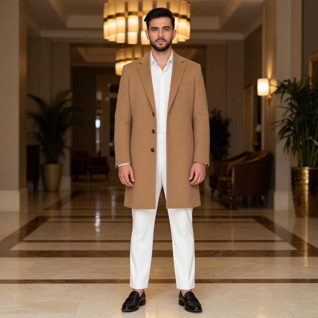 Photograph of a man standing in an elegant, dimly lit hallway with polished marble floors and warm ambient lighting. He has a medium build, dark hair, and a trimmed beard. He wears a tan, long, double-breasted overcoat over a white dress shirt, paired with white trousers and black dress shoes. The background features large, potted plants and ornate, round chandeliers. The man's expression is neutral, and he stands centered, facing the camera directly. The overall style is modern and sophisticated, with a focus on contrasting colors and clean lines.