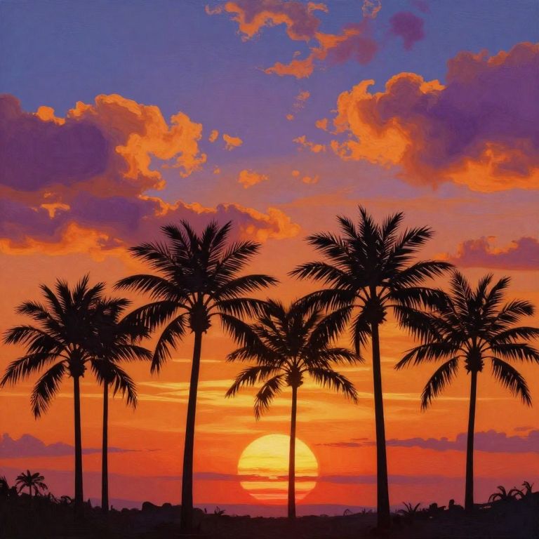 Vibrant sunset painting captures six silhouetted palm trees framing a golden sun as it descends over the horizon, surrounded by fluffy clouds tinged with hues of orange, purple, and blue.