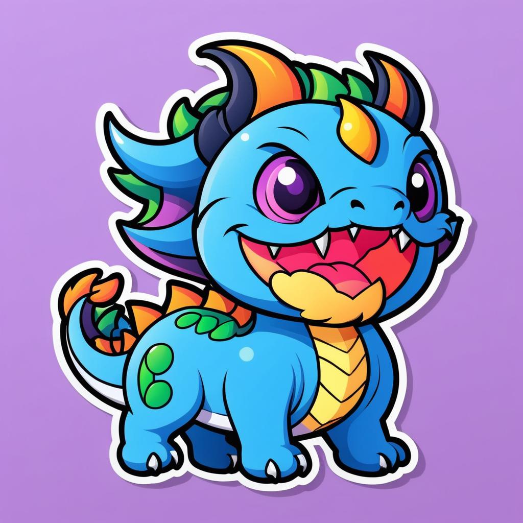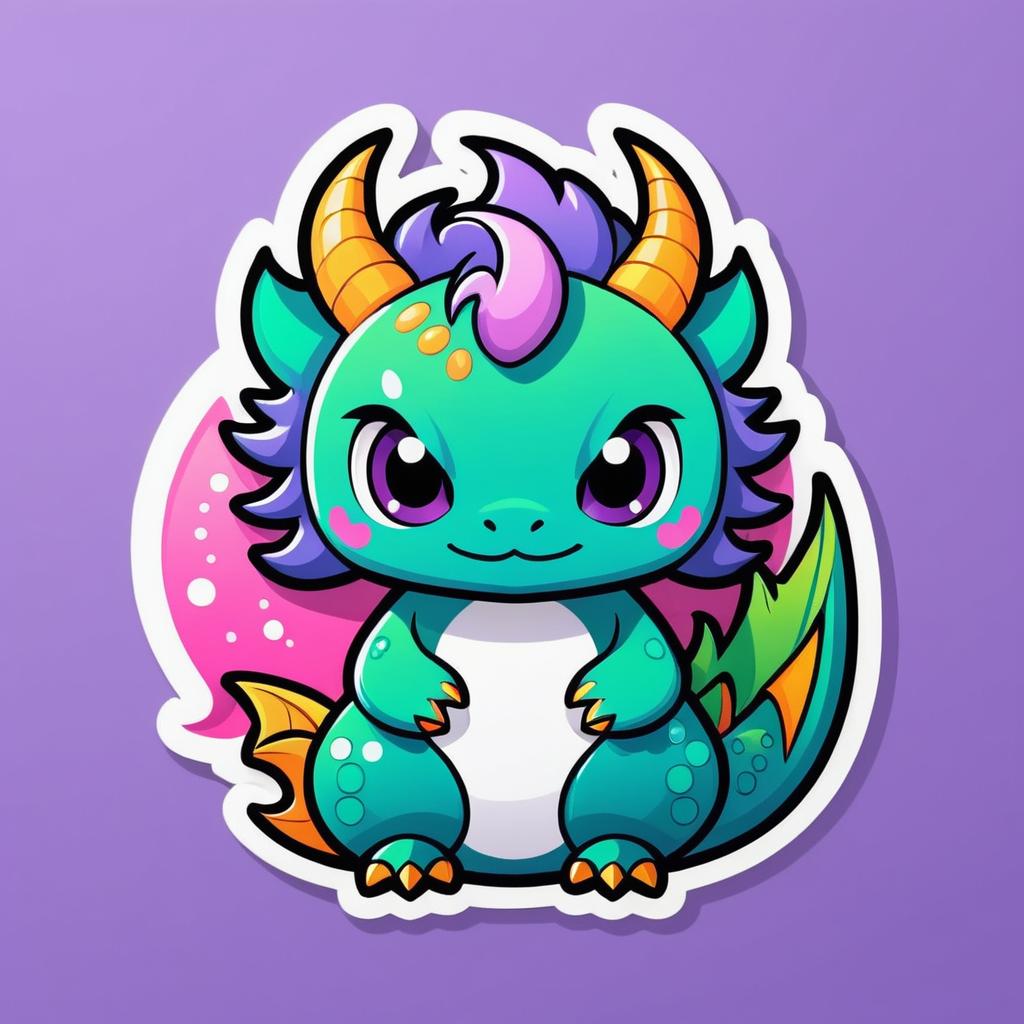 Illustration of a cute, vibrant green baby dragon with purple and pink accents, orange belly, and orange horns. The dragon has big expressive eyes, a playful smile with small teeth, and small wings, set against a purple background. Designed as a sticker with a white outline.