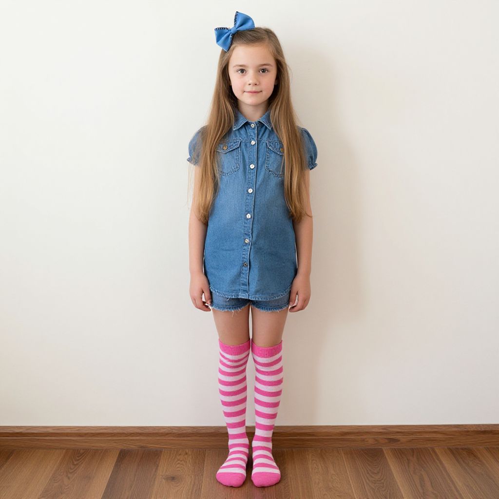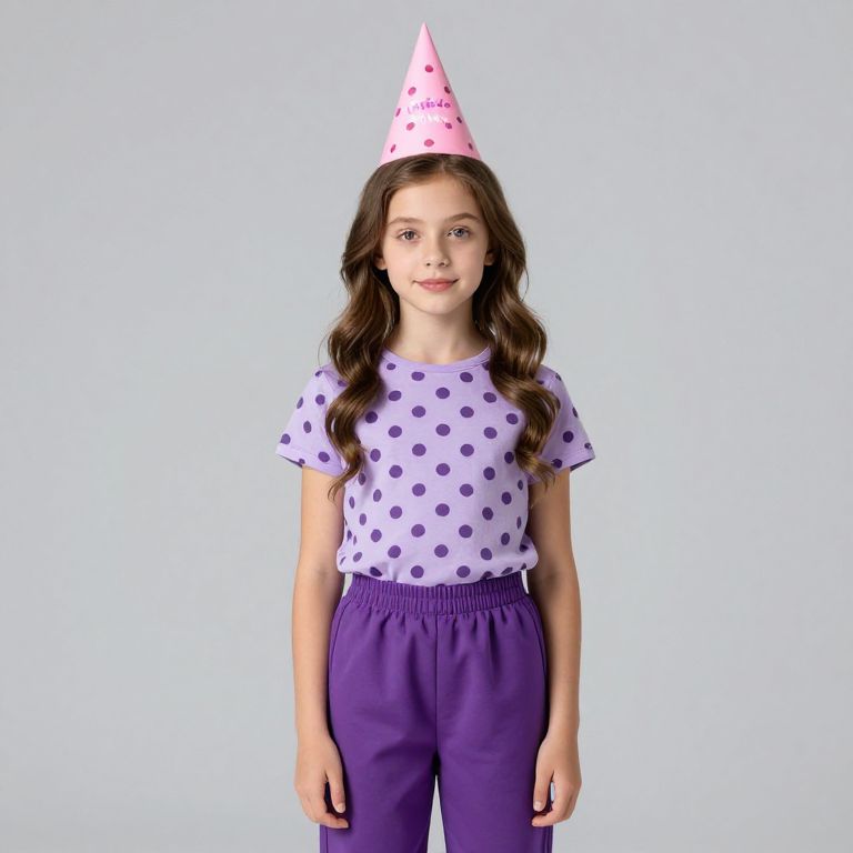Girl wearing a pink party hat and purple outfit with a polka dot shirt and purple pants.