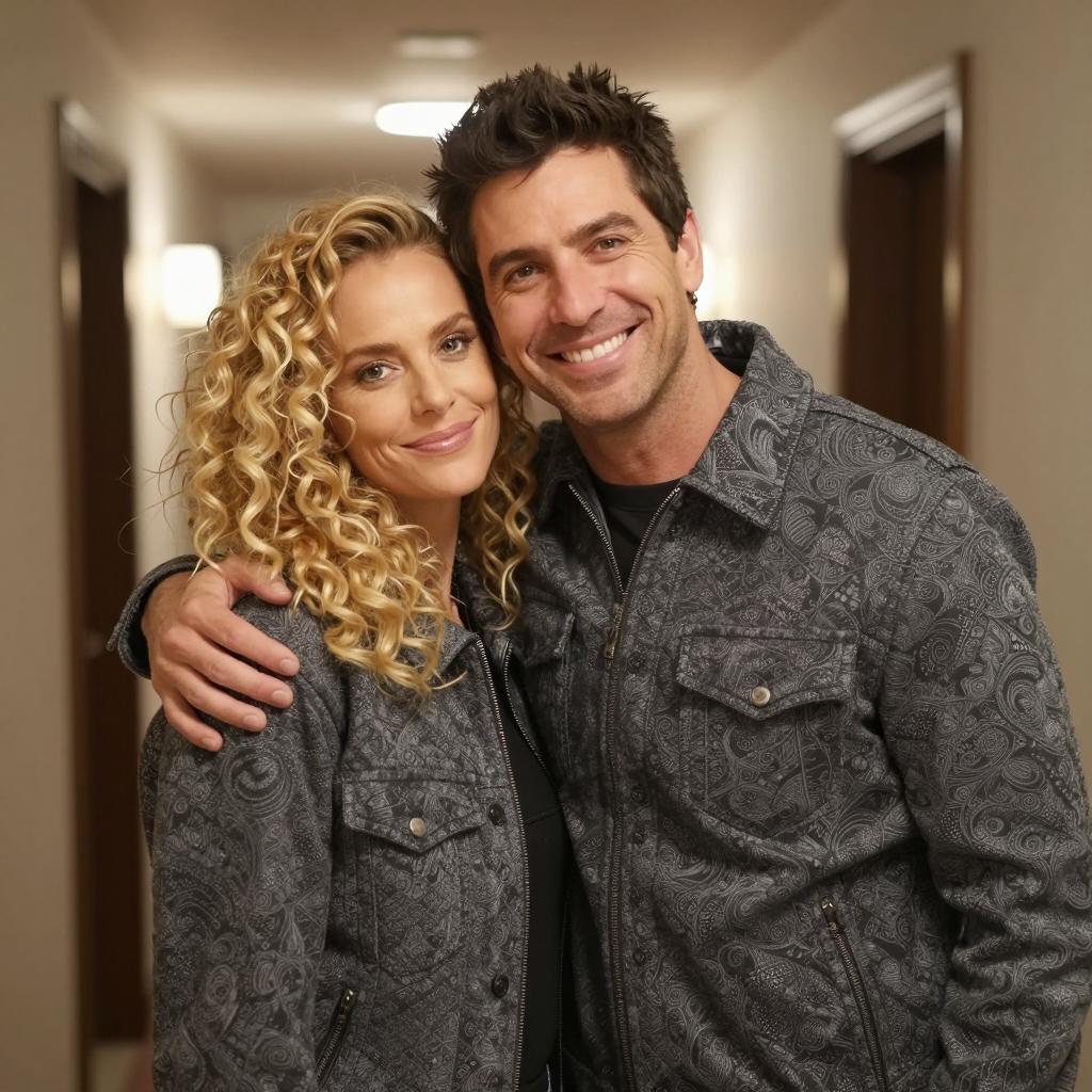 Photograph of a smiling man with dark hair and a woman with blonde curly hair leaning close, both wearing grey patterned jackets, in a warmly lit hallway with blurred background. Man's right arm around woman's shoulders, both looking at camera.