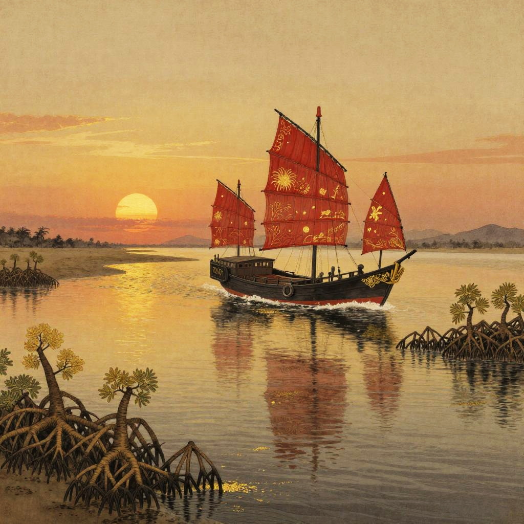 In a golden tidal estuary lined with mangrove roots, a ornate red-sailed Chinese junk sails gracefully across the horizon, as the sun sets, casting a warm glow over the water, captured in a intricate ink-and-gold-leaf illustration.