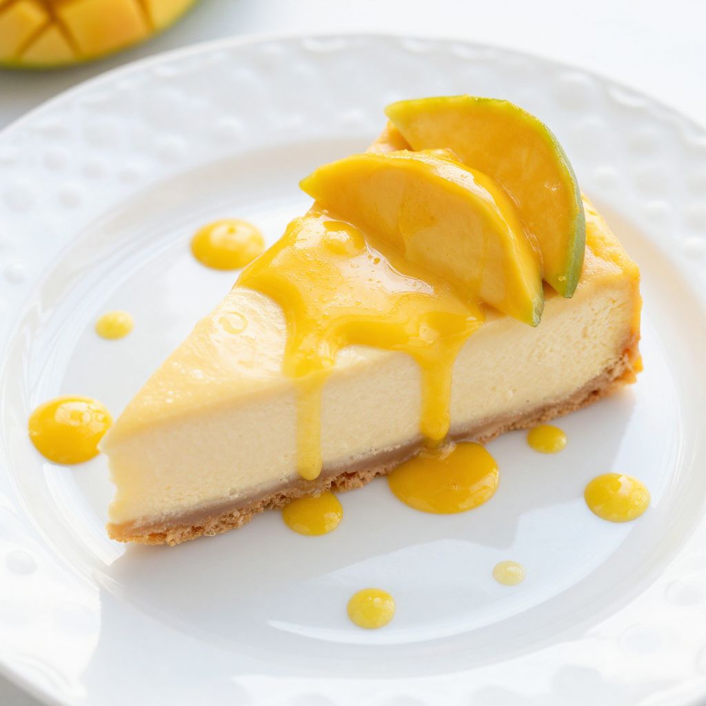 Photograph of a slice of creamy cheesecake with golden mango slices and syrup on a white plate, sunlight highlighting the textures.