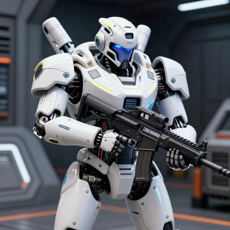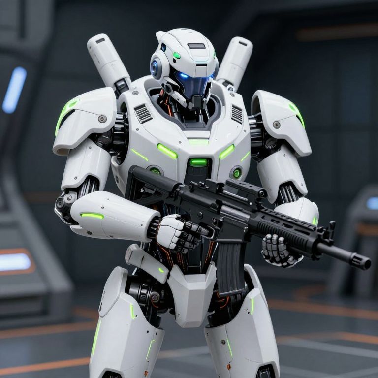 Photorealistic CGI of a white, futuristic, humanoid robot standing in a dimly lit, industrial environment. The robot has glowing neon green accents, a sleek helmet with a blue visor, and two missile-like attachments on its back. It holds a black, high-tech rifle in both hands. The background features blurred, metallic structures with blue and orange lights. The robot's design is sleek and angular, with intricate mechanical details and a strong, armored build. The overall aesthetic is sci-fi and cybernetic.