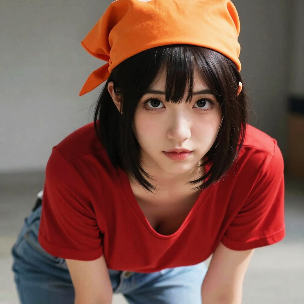 ((masterpiece, sidelighting, finely detailed beautiful eyes: 1.2)), (photorealistic:1.3), (((bent over, wearing loose red low-cut top and slip from Neckline and Neckline open, cleavage))), ultra-detailed, ultra high res, professional lighting, perfect anatomy, perfect face, perfect eyes, pandballgt, black eyes, black hair, short hair, 1girl, gloves, orange bandana, fingerless gloves, (japanese), (cosplay), light blue pants