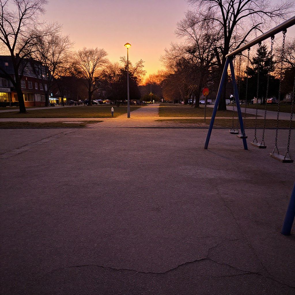 Childhood liminal space, vast empty park at twilight with frozen swings and cracked pavement, distant street lamps casting long shadows, a surreal calmness mixed with slight unease, colors transitioning between warm sunset hues and deep purples, evoking a sense of timeless nostalgia.