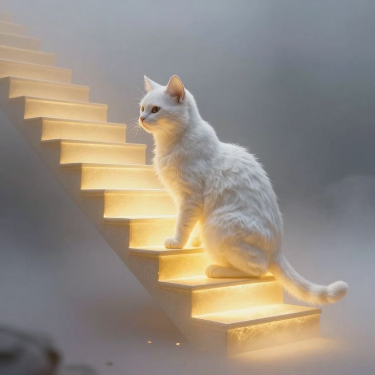 A luminous staircase ascends from the ethereal form of a white cat, its steps glowing with golden warmth amidst a misty void, symbolizing the timeless journey between wonder and mystery.
