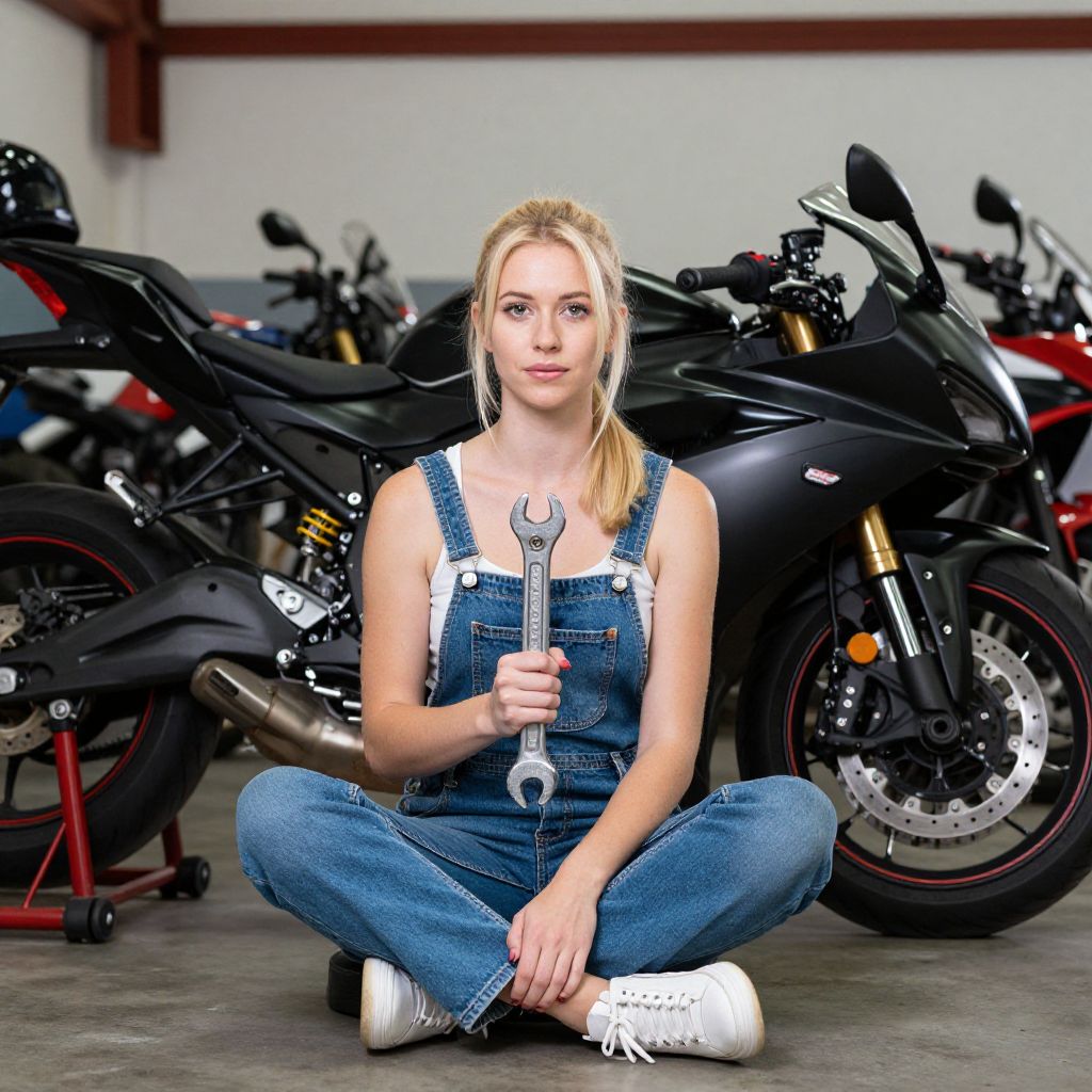 Blonde woman in blue denim overalls and white sneakers sits cross-legged, holding a wrench, surrounded by motorcycles in a garage.