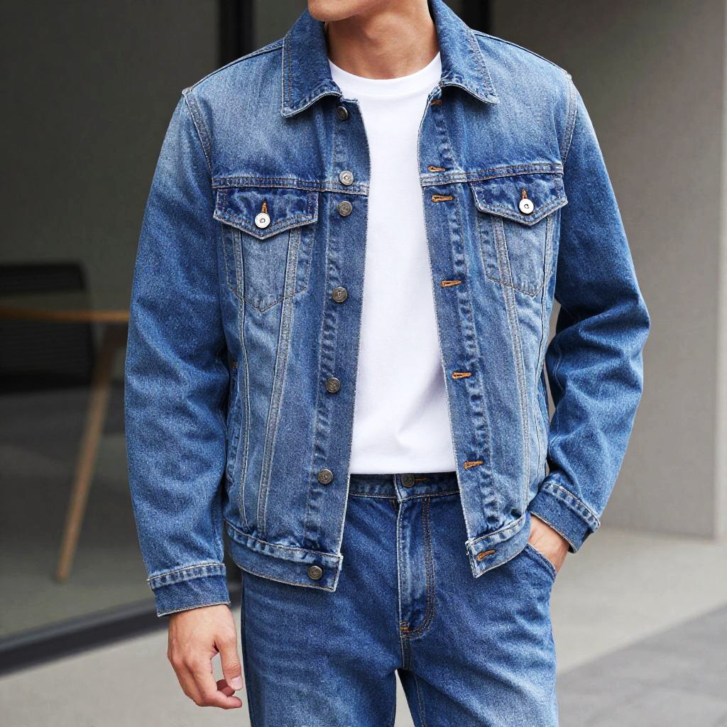 Photograph of a man wearing a blue denim jacket with buttons, white t-shirt, and matching blue jeans, standing with hands in pockets, outdoors,