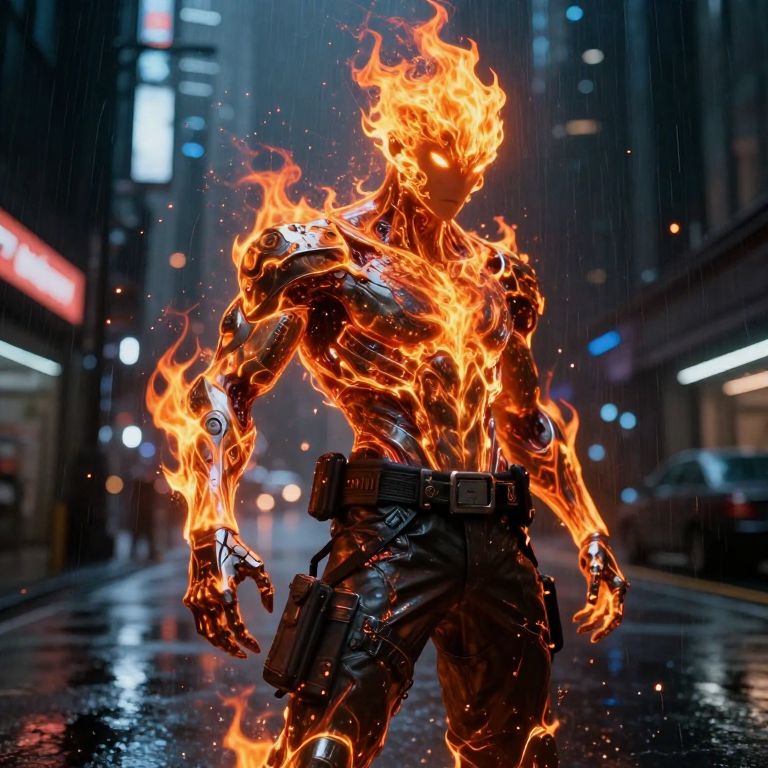 Photograph-like CGI of a muscular, robotic humanoid engulfed in bright orange and yellow flames, standing in a rainy urban street at night. The figure's metallic body contrasts with the vivid fire, with sparks flying off. It wears dark, tactical pants with a belt and a gun holster. The background features blurred, illuminated signs and buildings, with rain droplets visible on the wet street. The scene combines futuristic and dystopian elements, highlighting the contrast between the fiery figure and the dark, rainy cityscape.